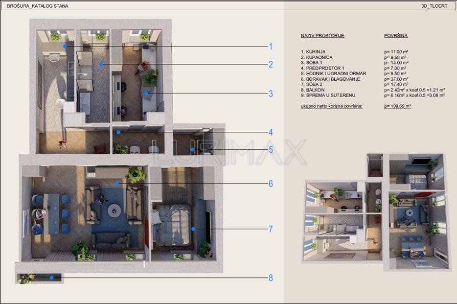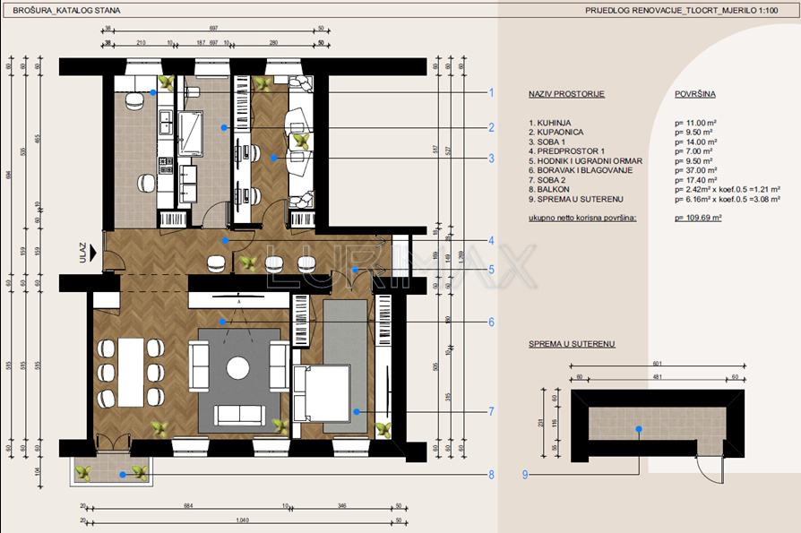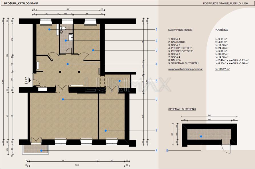 U naravi stan ima 113,27 m², dok je u zemljišnim knjigama upisano 97,45 m². Stan se koristio kao poslovni prostor tako da može poslužiti kao investicija.