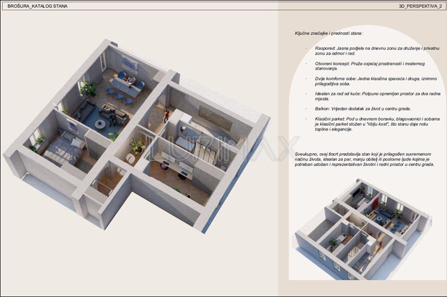 Idealan za urbani život, nudi savršenu kombinaciju udobnosti i dostupnosti svih gradskih sadržaja, te predstavlja izvrsnu priliku kako za život, tako i za investiciju (dnevni ili dugoročni najam) zbog svoje vrhunske lokacije.