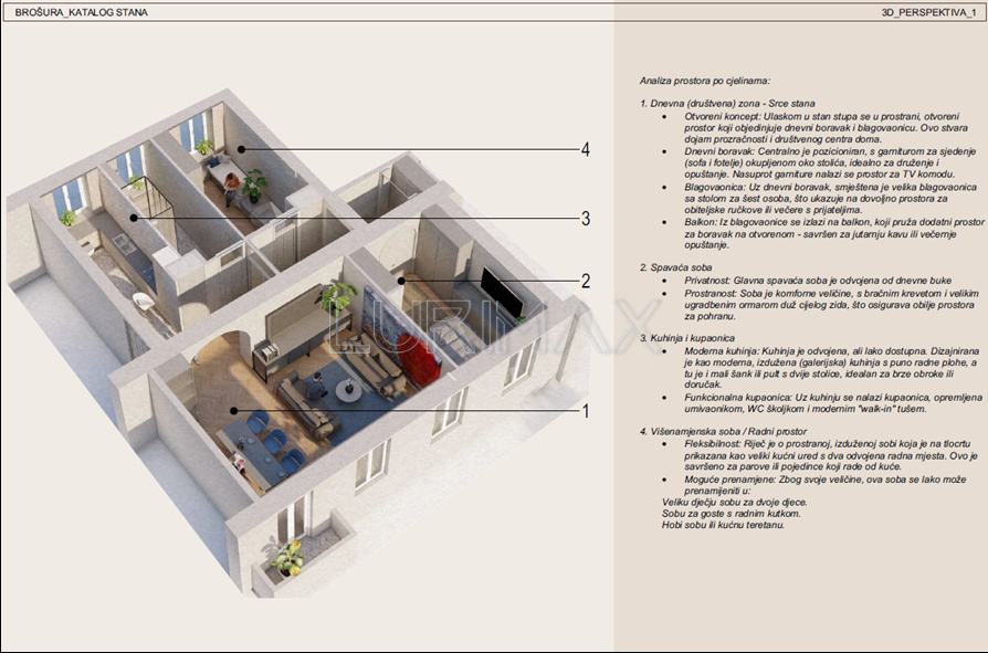 Svijetao je i prozračan zahvaljujući velikim prozorima i dvostranoj orijentaciji.