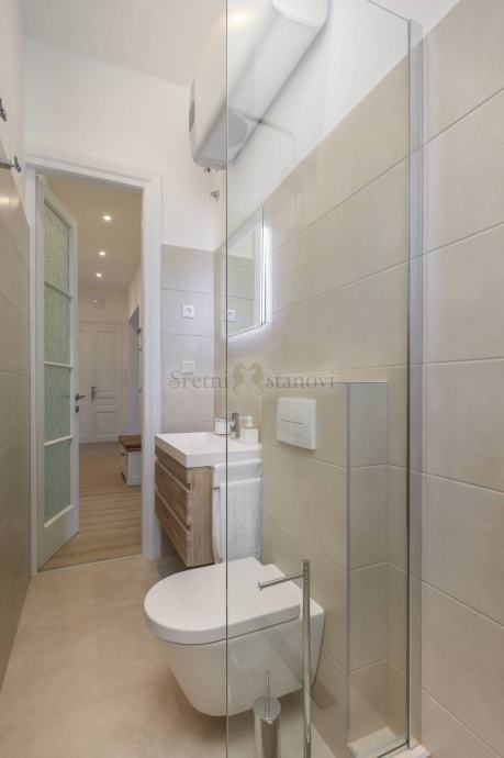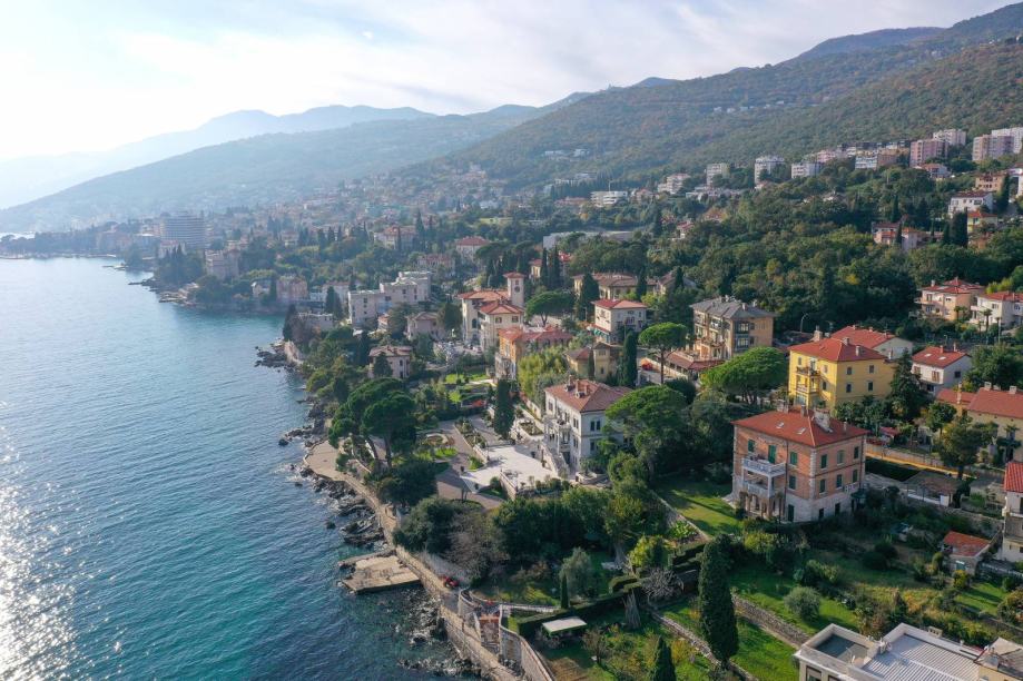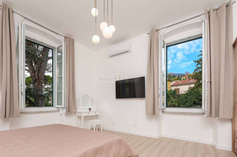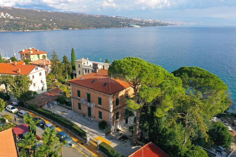 Ekskluzivna nekretnina - samo kod nas - jednosobni stan s dnevnim boravkom na prvom katu secesijske vile, besprijekorno održavane, okružene mediteranskim pejzažom i privatnim prilazom plaži i šetnici Lungo mare. Stan uz 1 prostranu spavaću sobu i veliki dnevni boravak ima i prostranu kuhinju koja ispunjava sva očekivanja ljubitelja kulinarstva te od hodnika, malog predsoblja i kupaonice s walk in tušom te podnim grijanjem.