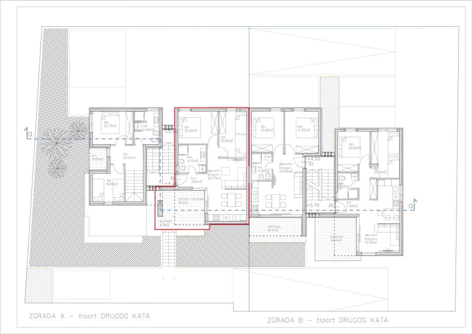 Stan A4 smješten je na drugom katu i prostire se na 67.63 m². Ovaj stan nudi izuzetan komfor kroz open space dnevni boravak s kuhinjom i blagovaonicom, dvije prostrane spavaće sobe te moderno uređenu kupaonicu. Iz dnevnog boravka izlazi se na veliku terasu s pogledom na more.