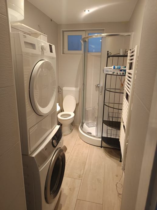 Sastoji od: ulaznog hodnika, manje kuhinje sa blagovaonicom, spavaće sobe sa bračnim krevetom, wc sa kupaonicom, te manja dnevna soba. Stan je opremljen novom perilicom za rublje, sušilicom i perilicom za suđe.