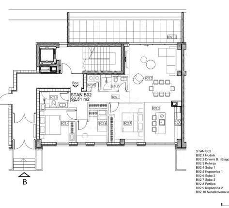 Sastoji se od ulaznog prostora, dnevnog boravka s kuhinjom i blagovaonicom, tri spavaće sobe, dvije kupaonice, ostave i natkrivene terase.