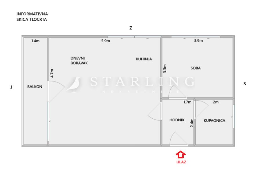 Stan se sastoji od dnevnog boravka s kuhinjom i blagovaonicom, spavaće sobe, kupaonice s WC-om, hodnika i balkona.