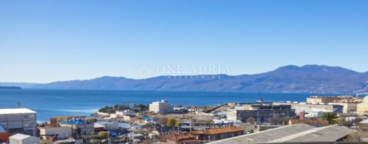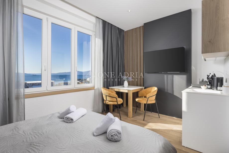 Glavni stan površine približno 80 m² koncipiran je kao moderan dvosobni stan s dnevnim boravkom otvorenog tipa. Ulazni hodnik sadrži diskretno organiziran utility prostor s perilicom, sušilicom i bojlerom, čime je svakodnevica maksimalno pojednostavljena. Centralni open space objedinjuje kuhinju, blagovaonicu i dnevni boravak te stvara prostranu i svijetlu cjelinu s izlazom na balkon. S balkona se pruža otvoren, panoramski pogled na cijeli Kvarner, što prostoru daje poseban dojam luksuza i mira usred gradske vreve.