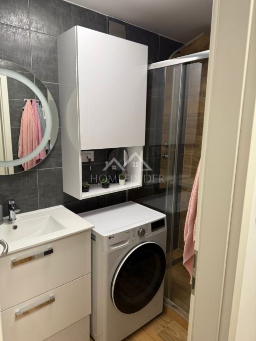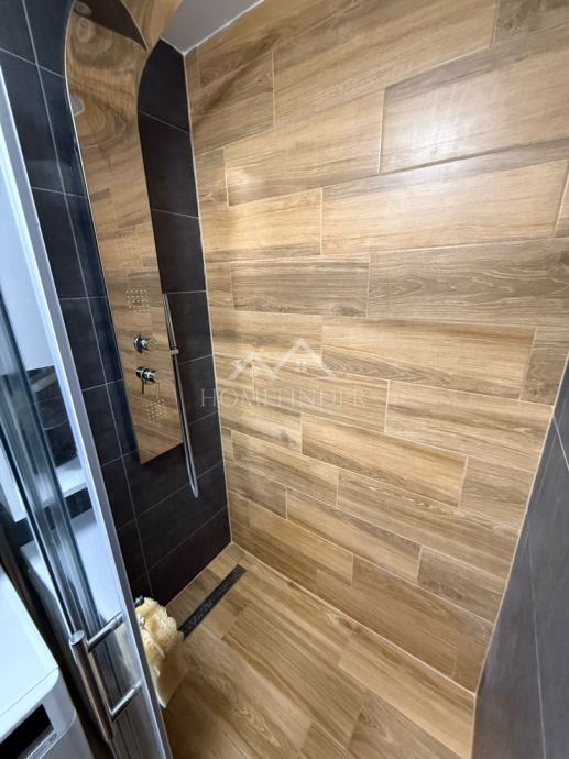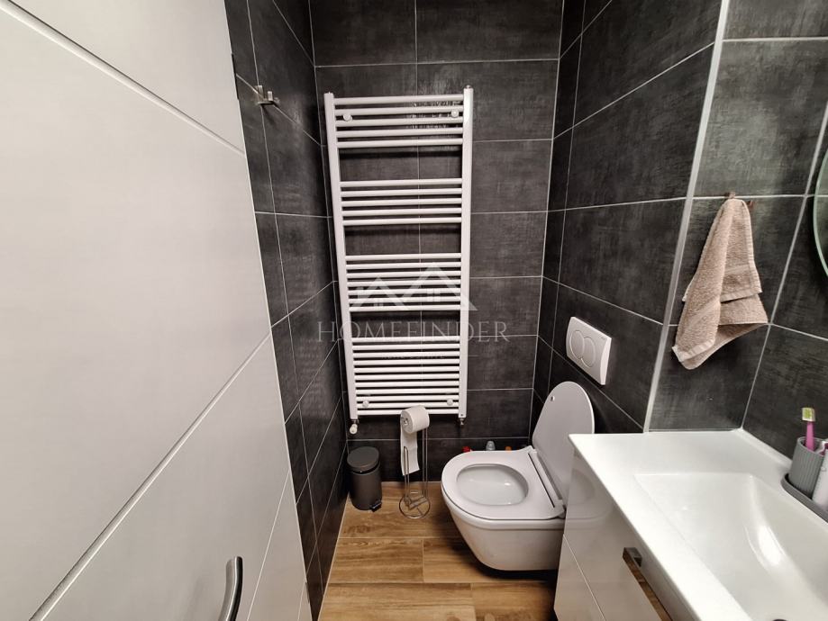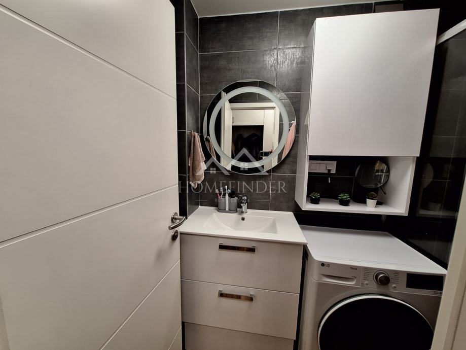 Kupaonica je uređena u modernom stilu i opremljena walk-in tuš kabinom. Sav namještaj u stanu izrađen je po mjeri od kvalitetnih materijala te se stan prodaje potpuno namješten. Kreveti su opremljeni madracima, iako se to ne vidi na fotografijama, budući da se u stanu trenutno živi.