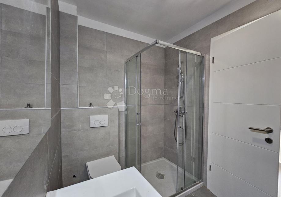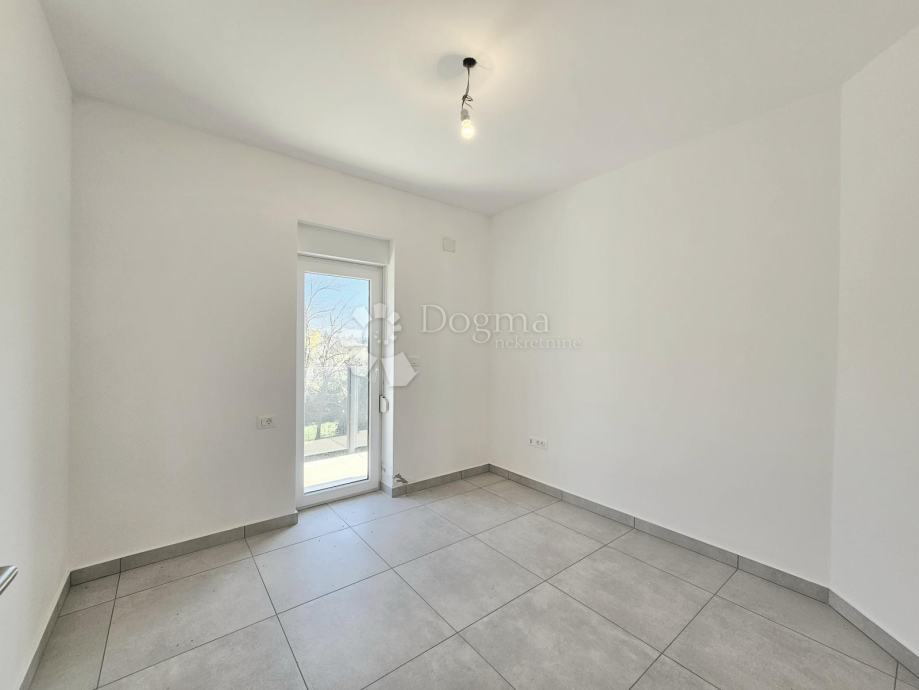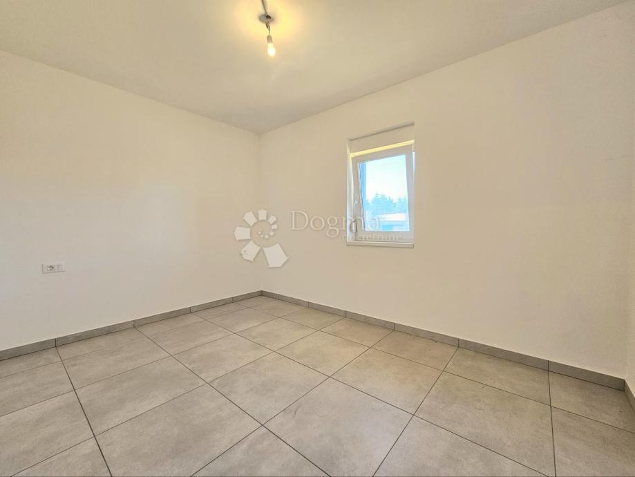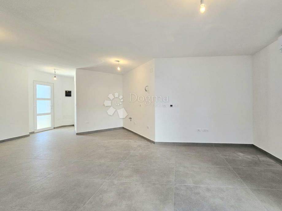 Površina stana je 73,76m2 i sastoji se od kuhinje s blagovaonom, kupaone, 2 spavaće sobe, balkonom i natkrivene terase okružene zelenim travnjakom.
