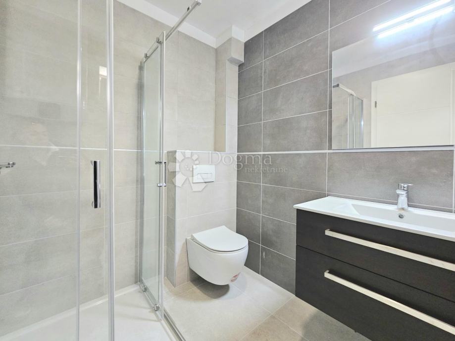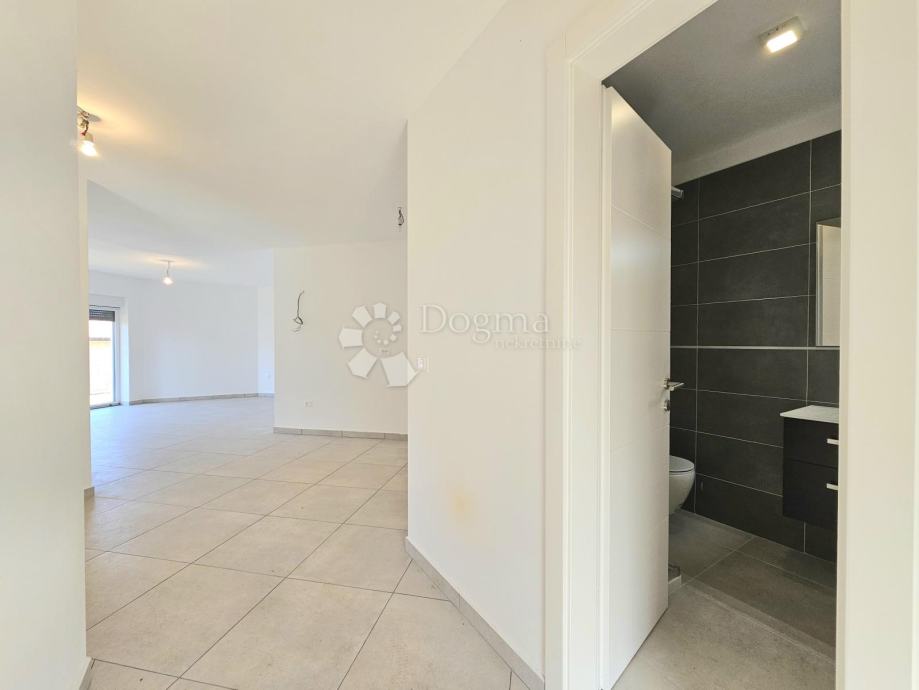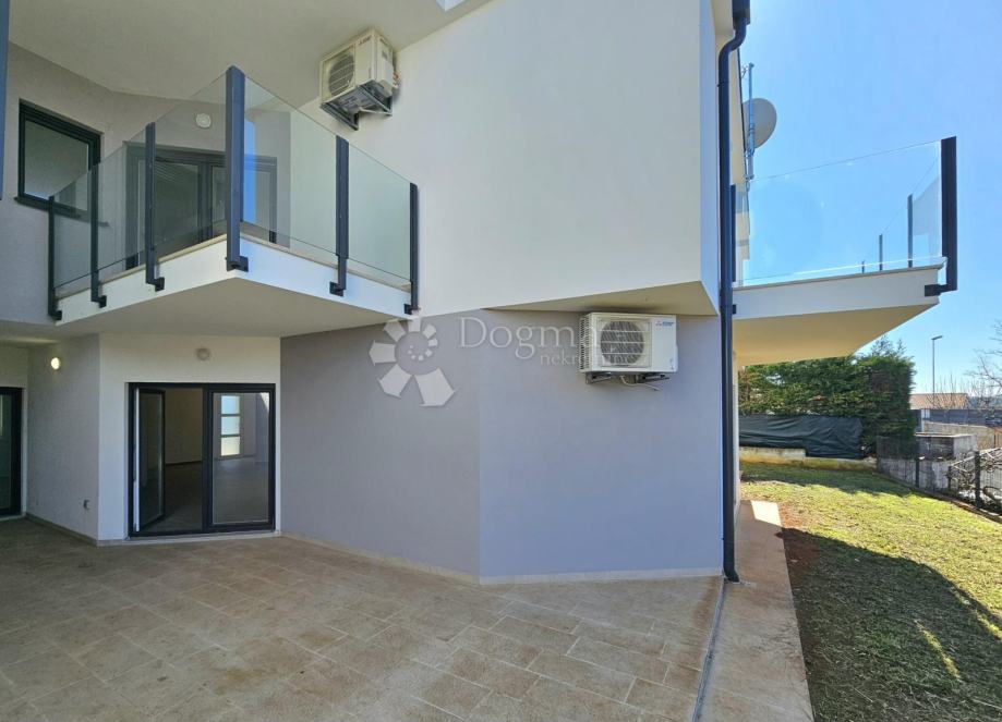 Površina stana je 73,76m2 i sastoji se od kuhinje s blagovaonom, kupaone, 2 spavaće sobe, balkonom i natkrivene terase okružene zelenim travnjakom.