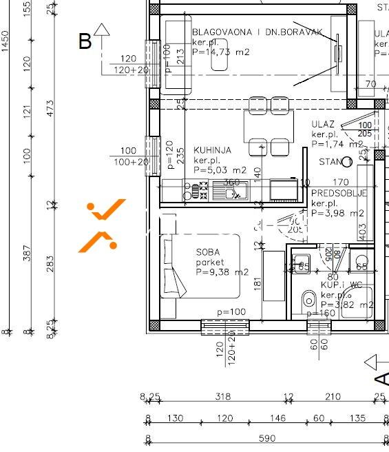 Stan se sastoji od hodnika, spavaće sobe, kupaonice te kuhinje s blagovaonicom i dnevnim boravkom. Uz stan dolazi i pripadajuće parkirno mjesto te spremište površine 10,86 m² u podrumu zgrade (4,86 m² neto).OpremaStan ima podno električno grijanje u cijelom prostoru te dvije klima jedinice – jednu u dnevnom boravku i jednu u spavaćoj sobi. Stolarija je PVC s troslojnim staklom, električnim roletama i komarnicima. Podovi su obloženi kombinacijom pločica i parketa. Ulazna vrata su protuprovalna i protupožarna. Zgrada je građena ciglenim termo blokom, s fasadom izoliranom stiroporom debljine 10 cm. Objekt je priključen na kanalizaciju, a završetak izgradnje planiran je za 2026. godinu.