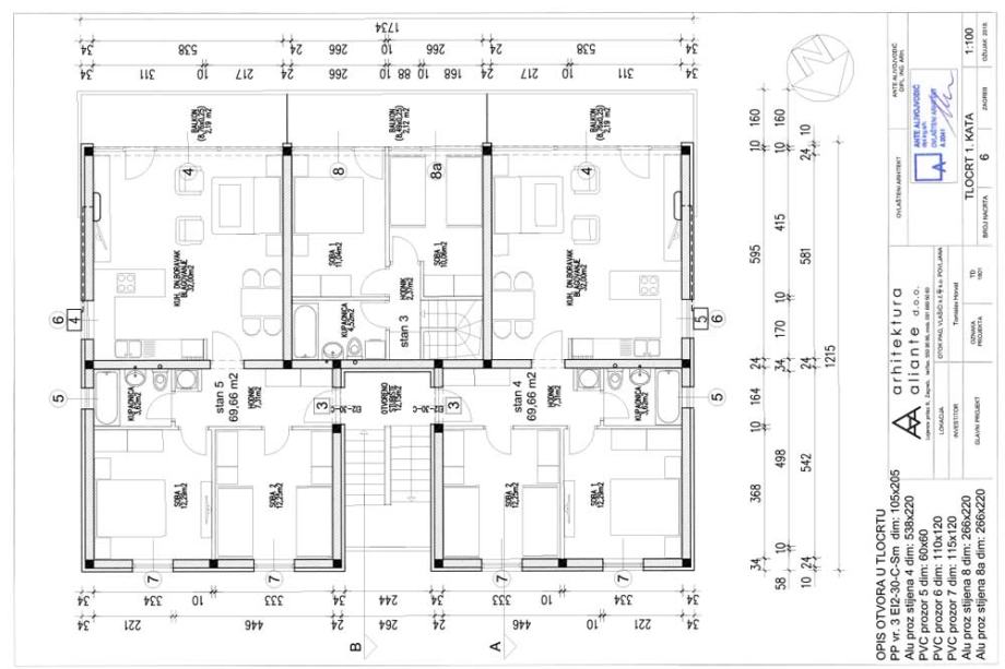 Prodaje se trosoban stan oznake STAN 4 u objektu B, koji se sastoji od: hodnika, dvije spavaće sobe, kupaone s wc-om, kuhinje i blagovaone, dnevnog boravka, balkona. Stanu pripada garažno parkirno mjesto, spremište u podrumu, ukupne neto korisne površine 79,58 m2. Stvarna površina stana iznosi 96,08 m2.