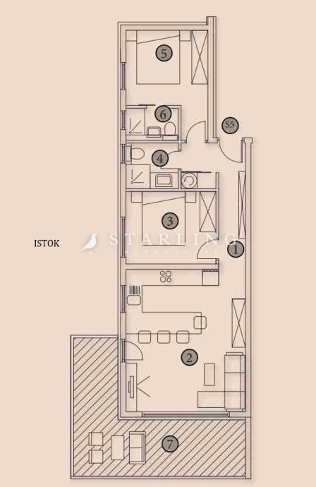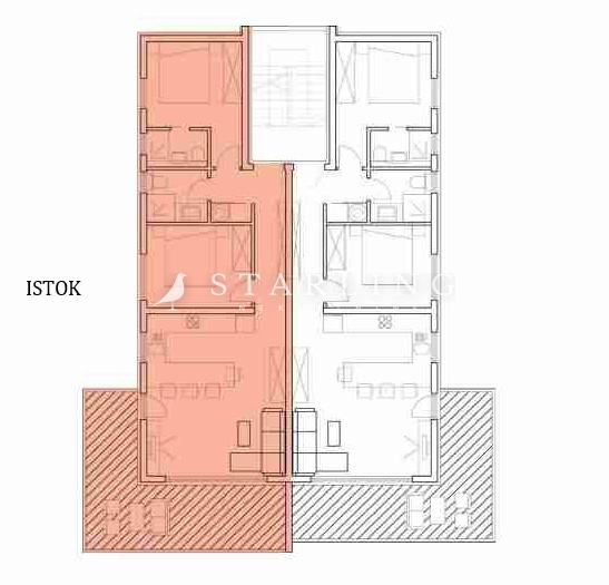 Stan se sastoji od dnevnog boravka s kuhinjom i blagovaonicom, dvije spavaće sobe, dvije kupaonice s wc-om i hodnika na jednoj etaži i krovne terase površine 95 m2 u drugoj etaži.