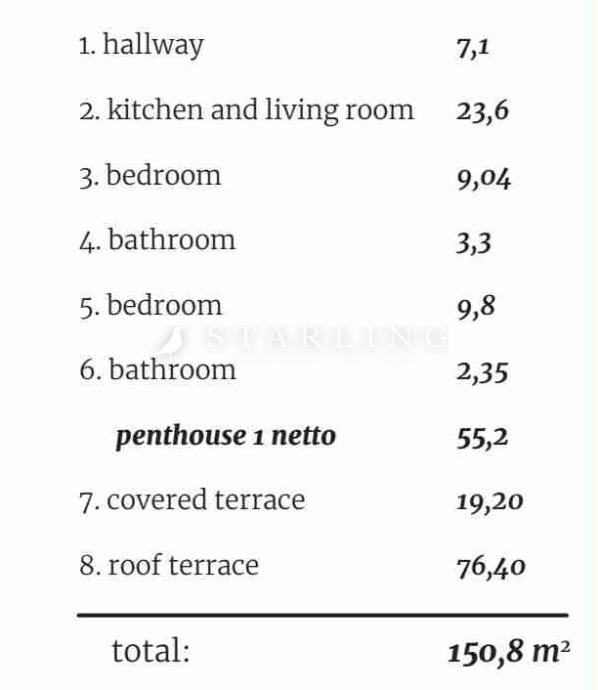 Neto površina samog stana je 55,2 m2, a ukupna površina s krovnom terasom je neto površina 76 m2 ( ukupna brutto površina ove nekretnine je 150 m2)