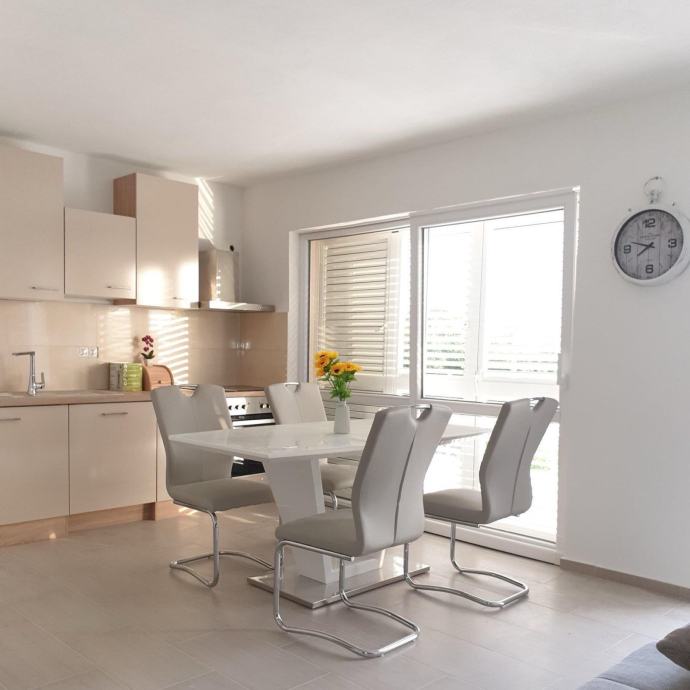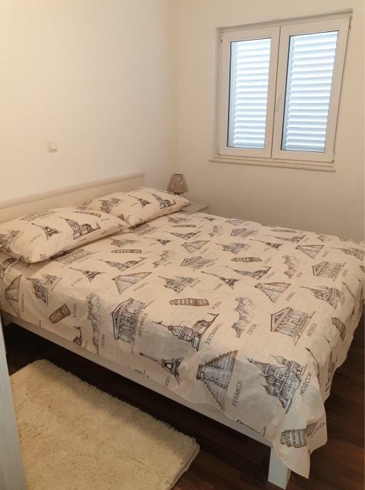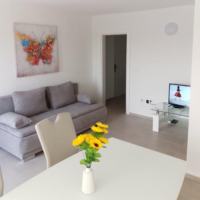 Sastoji se od 1 spavaće sobe s bračnim krevetom, dnevnog boravka s kaučem na razvlačenje, kuhinje, kupaonice i balkona. Opremljen je klimom, SAT-TV, wifi, perilicom za rublje i za posuđe. Nalazi se u mirnom susjedstvu, 50m od autobusne stanice.