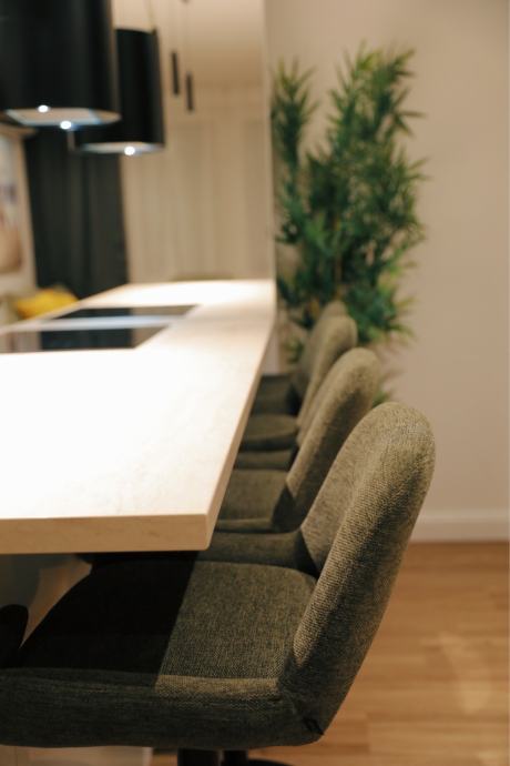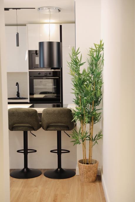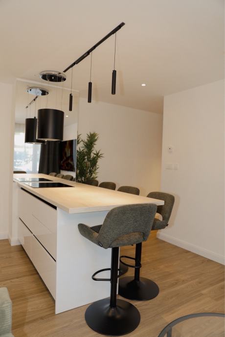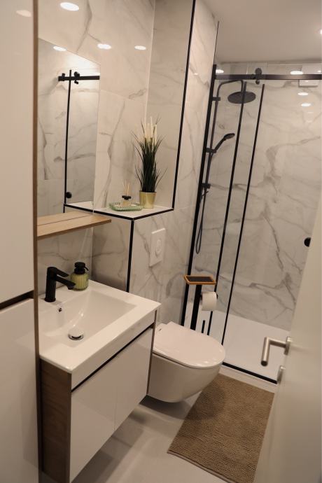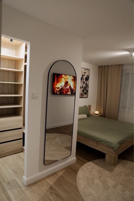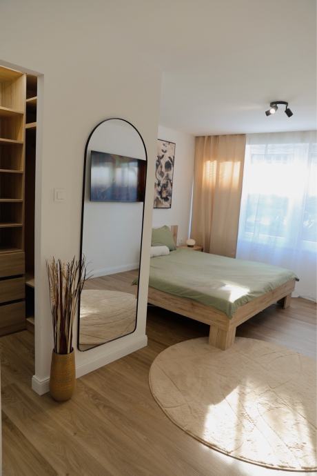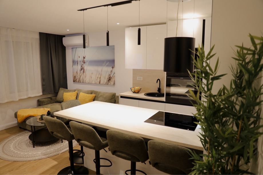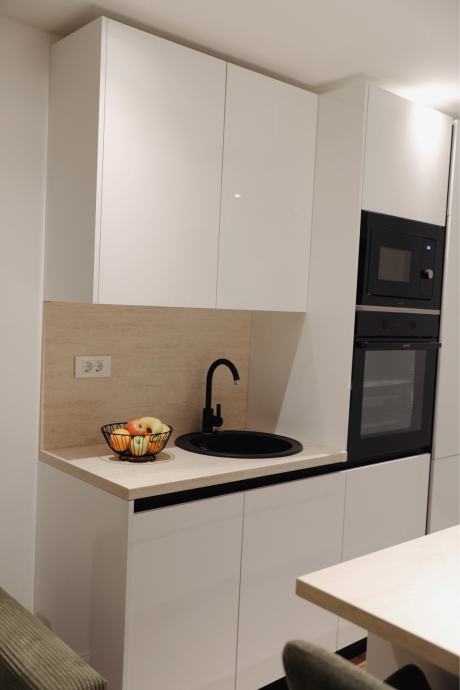 - Nova moderna kuhinja rađena po mjeri sa ugradbenim velikim hladnjakom, perilicom posuđa, mikrovalnom, pečnicom, indukcijskom pločom.
