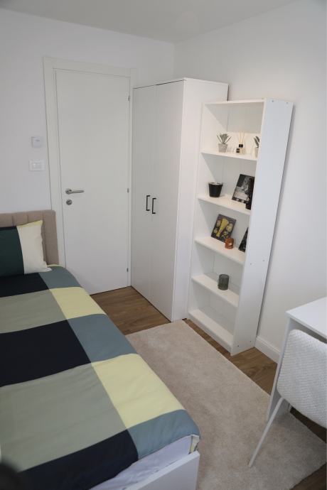 Stan se sastoji od dnevnog boravka s kuhinjom, blagavaonice, dvije spavaće sobe +Walk in ormar, hodnika, kupaonice te vešeraja s kotlovnicom.