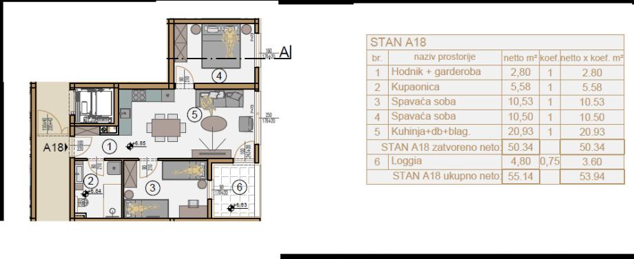 Stan ukupne površine 53,94 m² sastoji se od ulaznog hodnika s garderobnim prostorom, otvorenog koncepta kuhinje, dnevnog boravka i blagovaonice, dvije spavaće sobe te moderne kupaonice. Posebnu vrijednost daje loggia, idealna za boravak tijekom cijele godine. Stanu pripada i garažno mjesto smješteno u podzemnoj etaži zgrade.