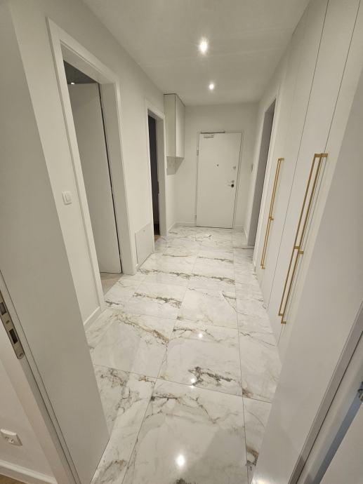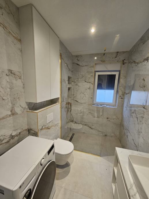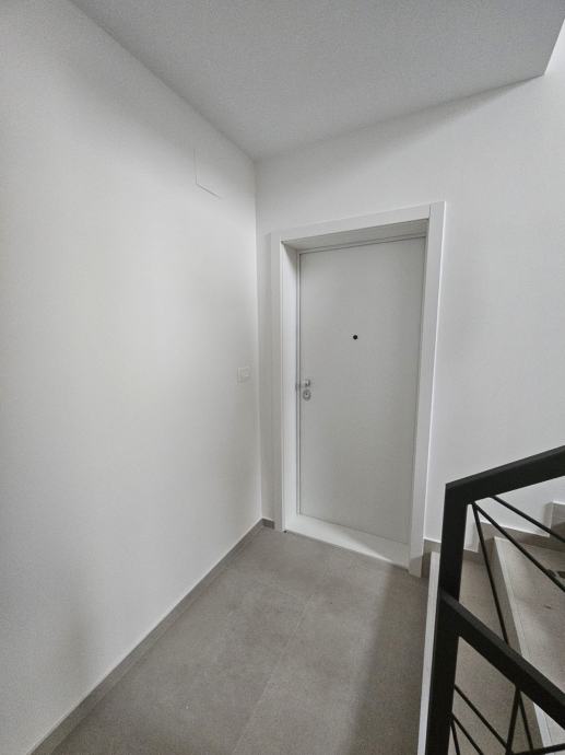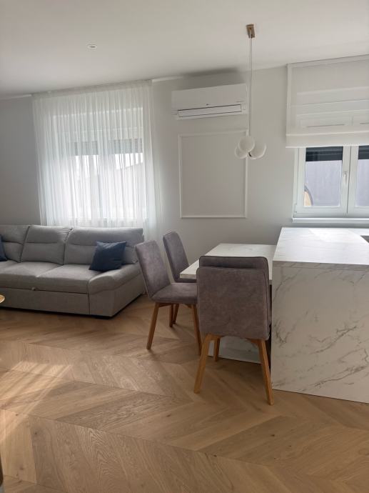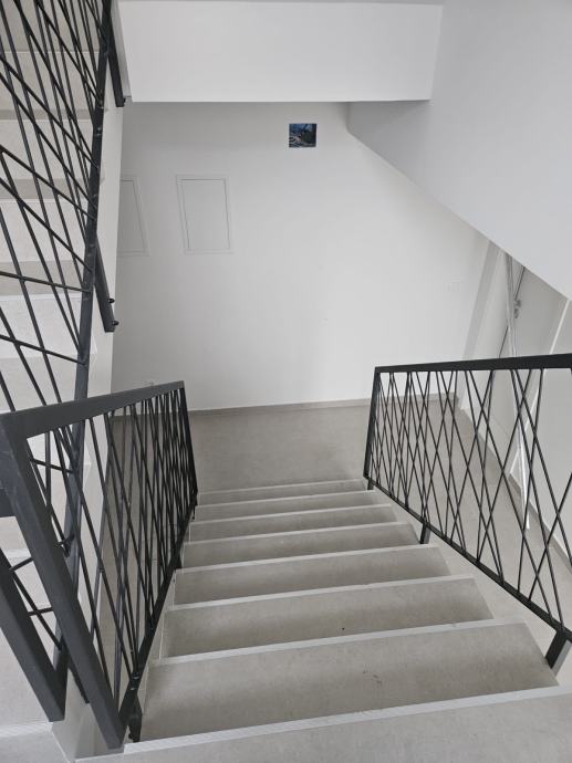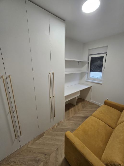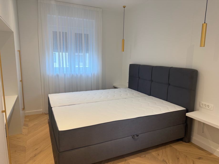 Stan se nalazi na 1.katu i ima 2 prostrane spavaće sobe, hodnik, kupaonu, kuhinju i dnevni boravak, lođu i parking. Stan je u potpunosti namješten ugradbenim ormarima, stolovima, krevetima, kuhinjom, zavjesama te potrebnom bijelom tehnikom: frižider sa škrinjom, perilica posuđa, perilica rublja, TV, pećnica, indukcijska ploča. Aparati su Bosch i Samsung.
