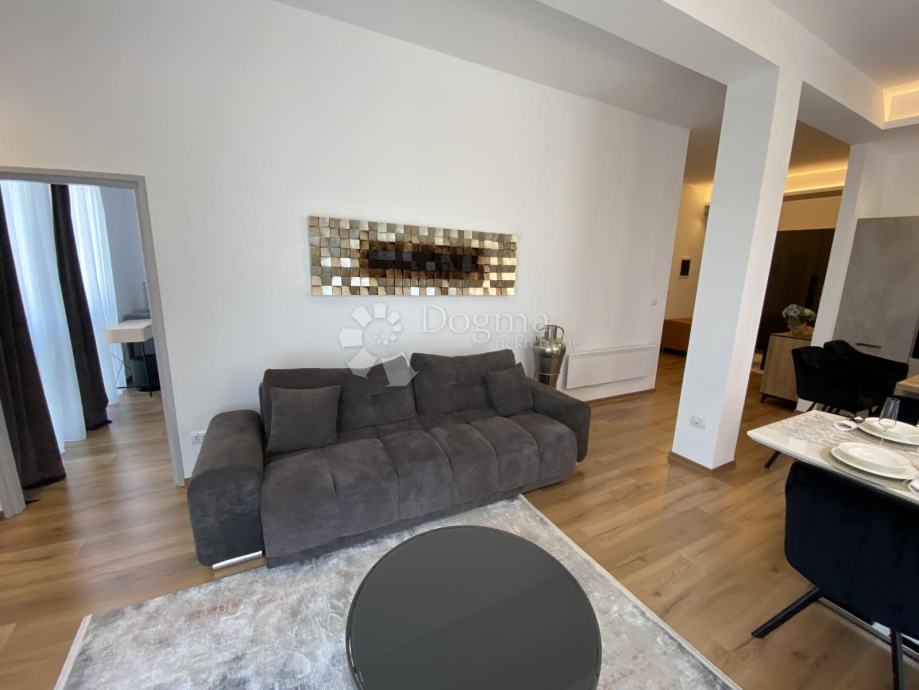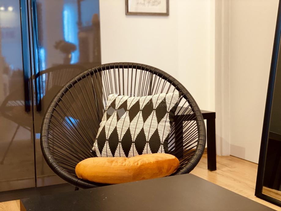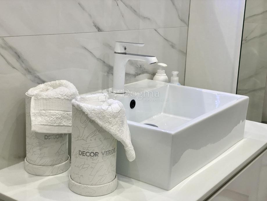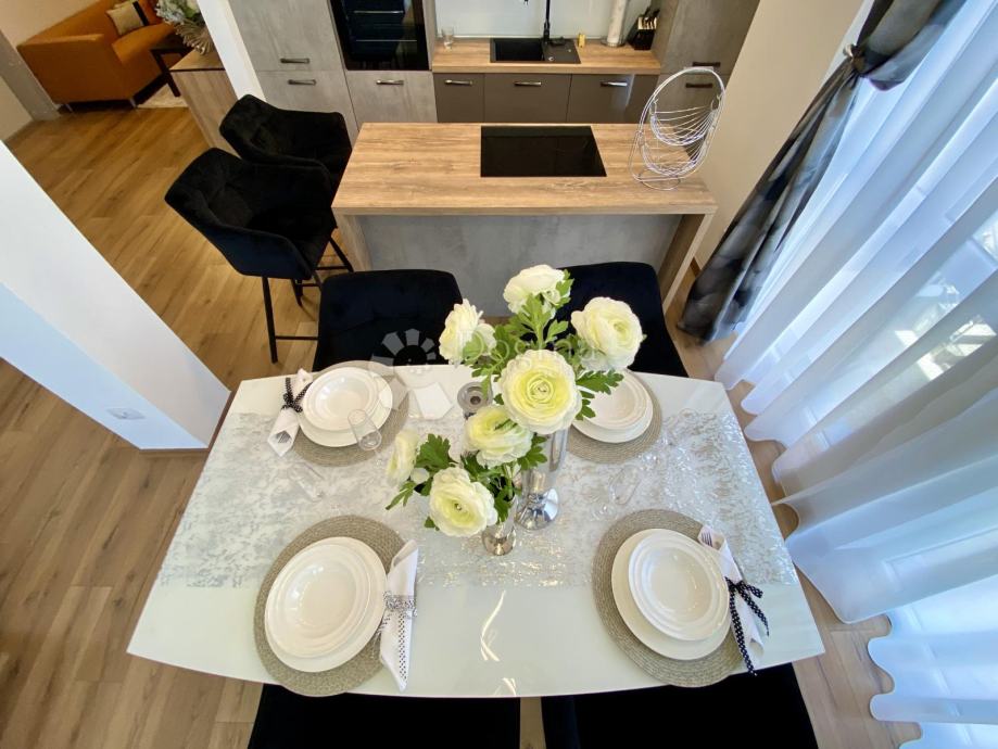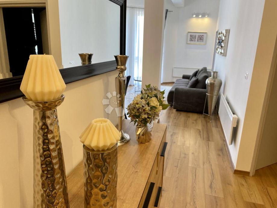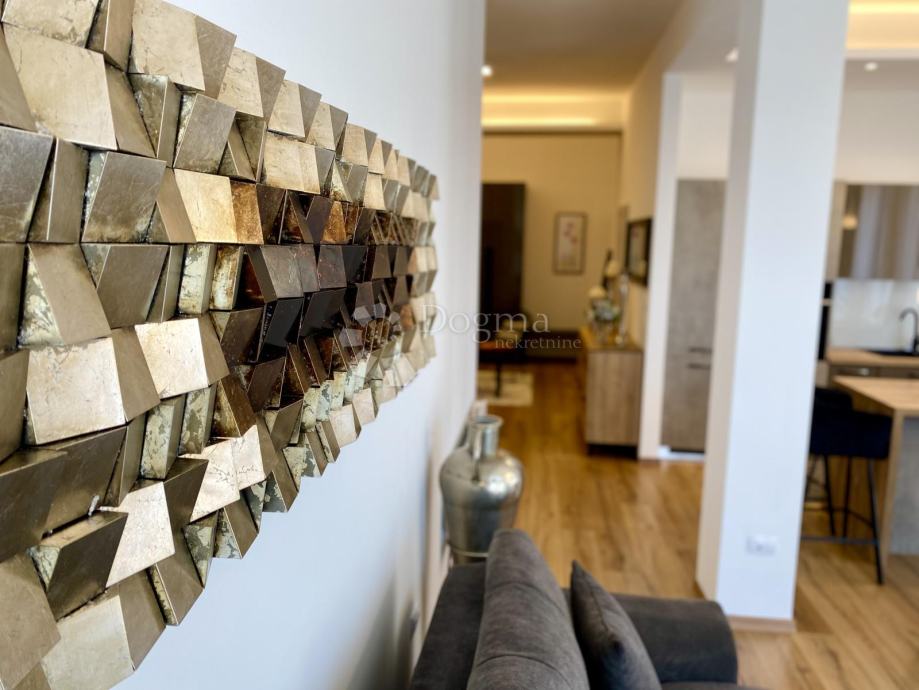 Stan se prostire na 85 m² i sastoji se od predsoblja, ostave, kupaonice i dodatnog WC-a, prostranog dnevnog boravka, moderne kuhinje s otokom, blagovaonice te dvije spavaće sobe. Master soba ima king-size krevet dimenzija 200x200 cm i prekrasan pogled na grad, dok druga spavaća soba ima klasični bračni krevet.