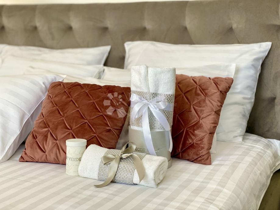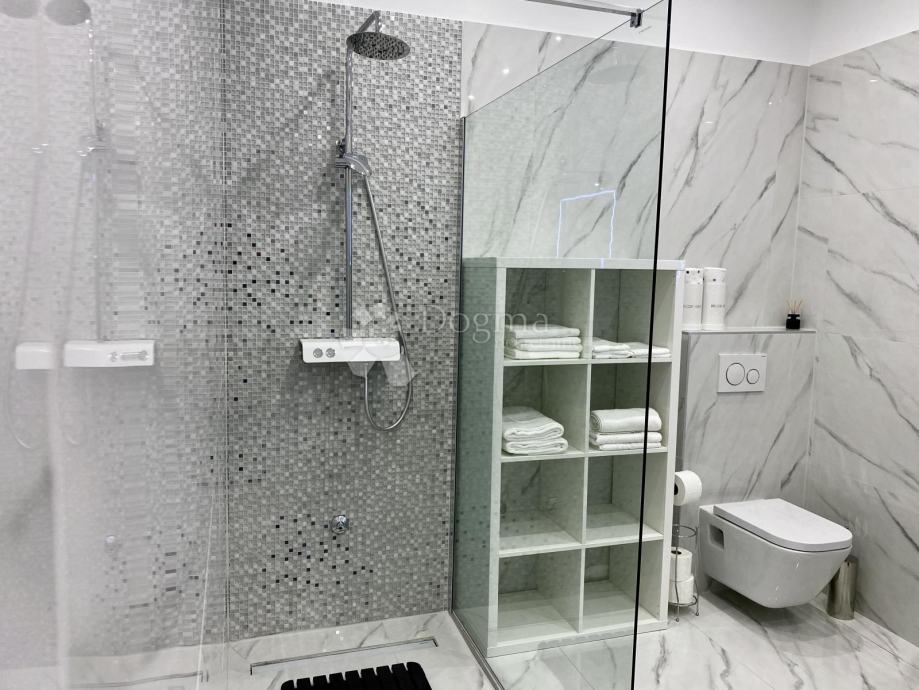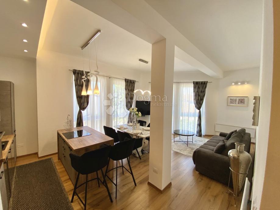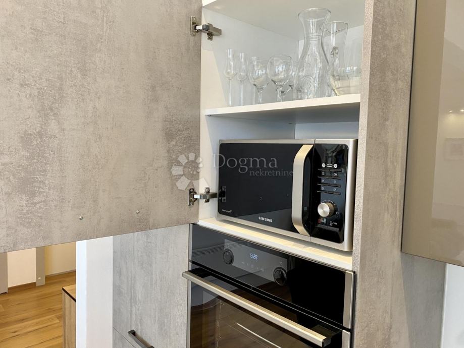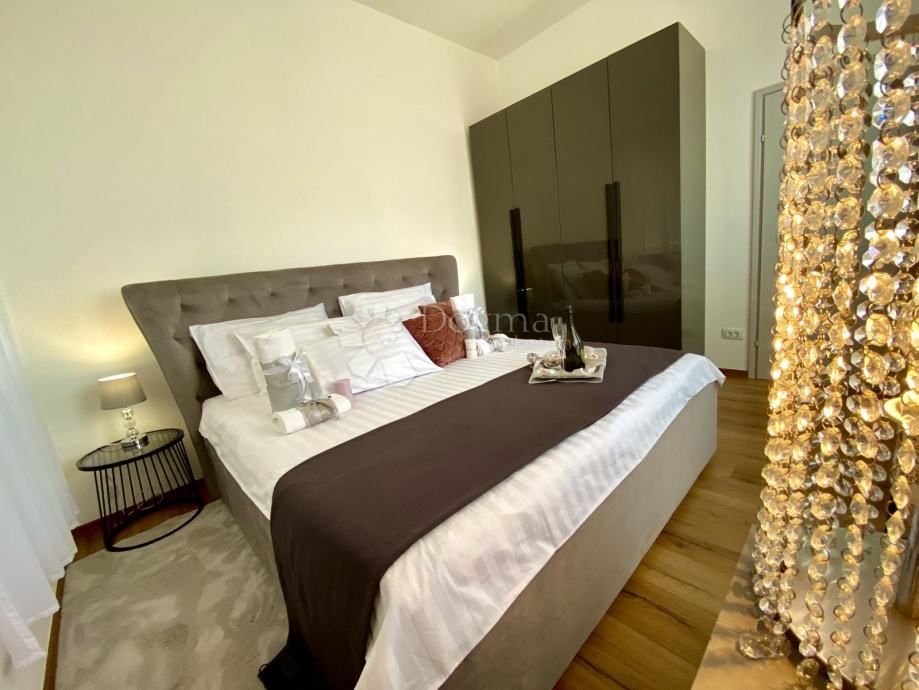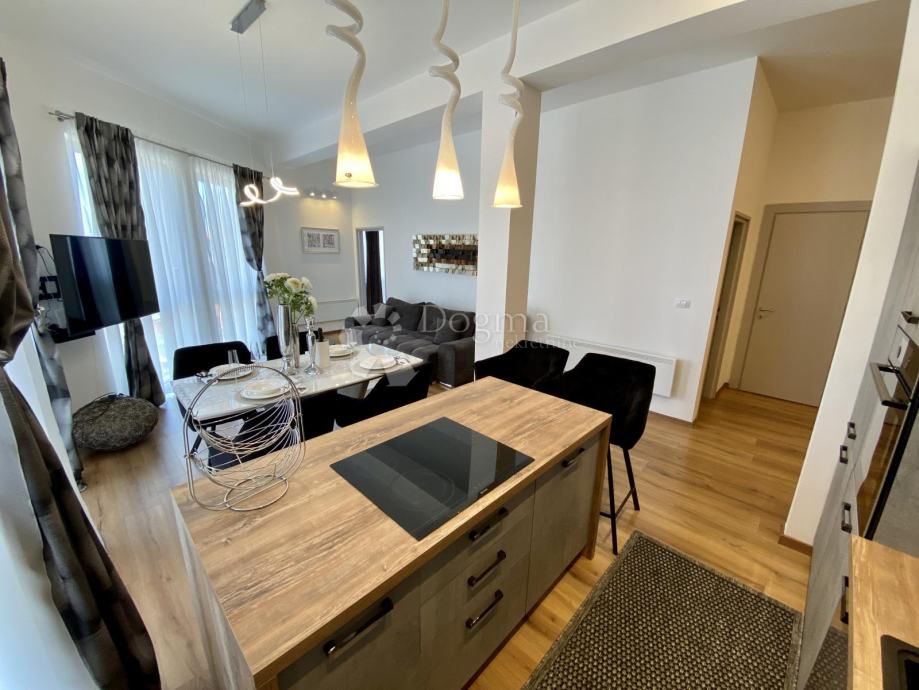 Stan se prostire na 85 m² i sastoji se od predsoblja, ostave, kupaonice i dodatnog WC-a, prostranog dnevnog boravka, moderne kuhinje s otokom, blagovaonice te dvije spavaće sobe. Master soba ima king-size krevet dimenzija 200x200 cm i prekrasan pogled na grad, dok druga spavaća soba ima klasični bračni krevet.