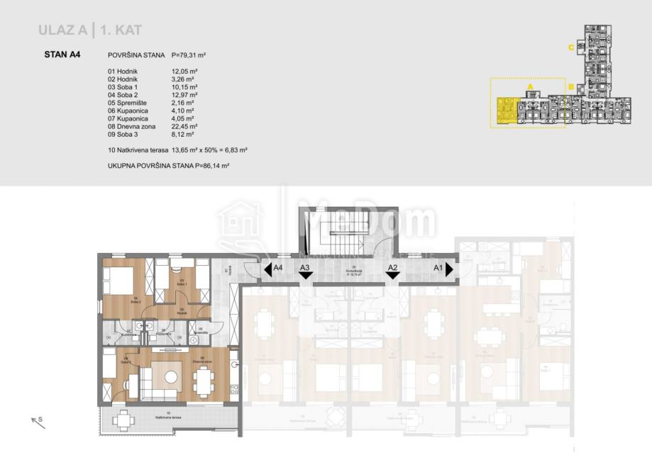 Prodajemo novi stan u Labinu površine 86,14m2 na mirnoj lokaciji. Stan se sastoji od dva hodnika, dnevnog boravka sa blagovaonicom i kuhinjom, tri spavaće sobe, dvije kupaonice, spremišta i natkrivene terase. Površina stana je 79,31m2 a terasa je površine 13,65m2(faktor x 0,5). Završetak izgradnje planiran je za kraj 2025. godine a dobivanje uporabne dozvole početkom 2026. Investitor je dokazana i pouzdana kompanija koja je sagradila veliki broj stanova na području Istre za veliki broj zadovoljnih kupaca. Potpisivanjem predugovora rezervirate kupovinu stana. Ugovor se potpisuje nakon dobivanja uporabne dozvole nakon čega je stan Vaš.