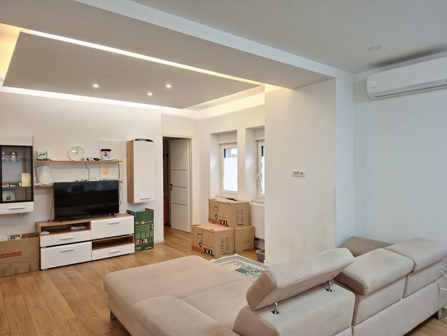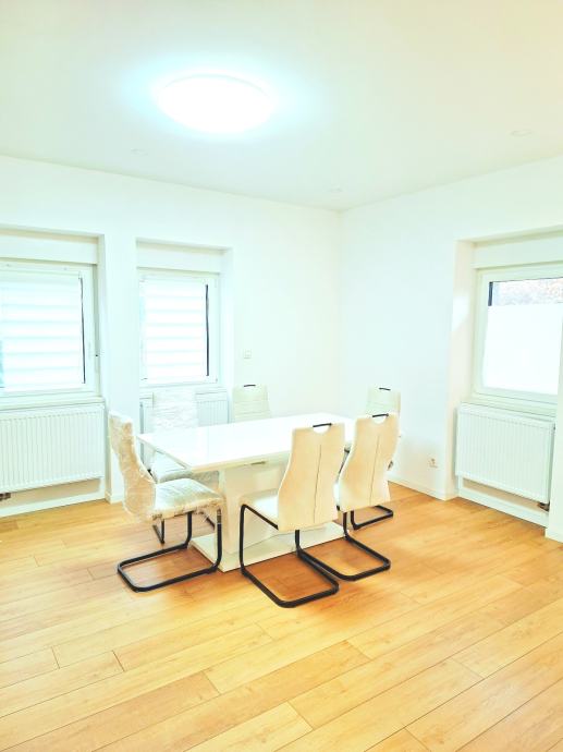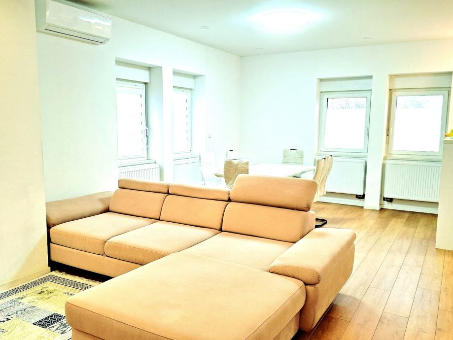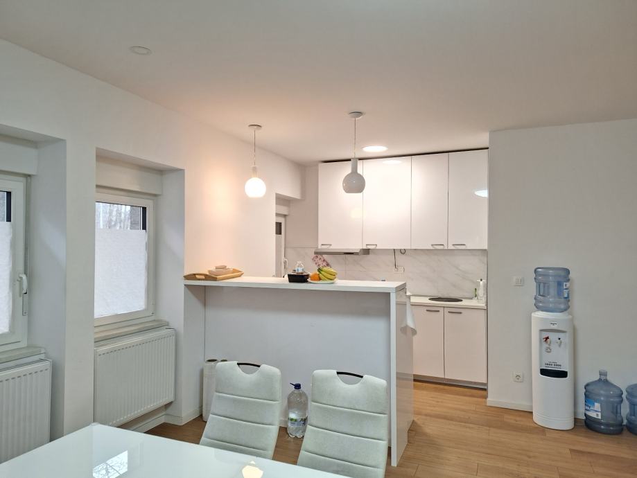 Dnevni boravak, blagovaonica i kuhinja, čine zajednički povezani prostor. Cijeli je stan vrlo otvoren i svijetao, te okružen zelenom okućnicom.