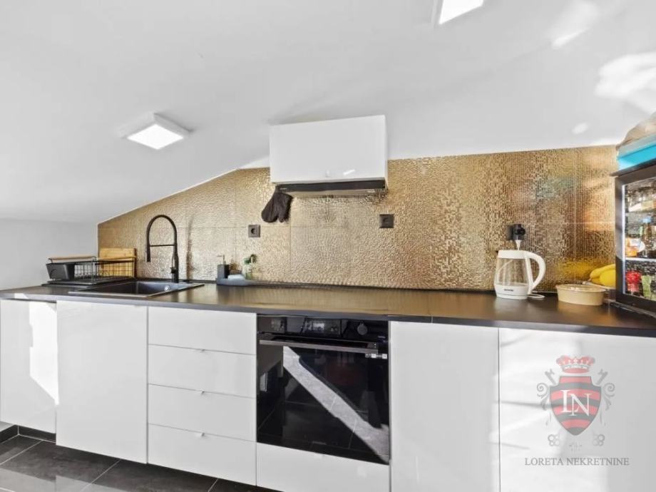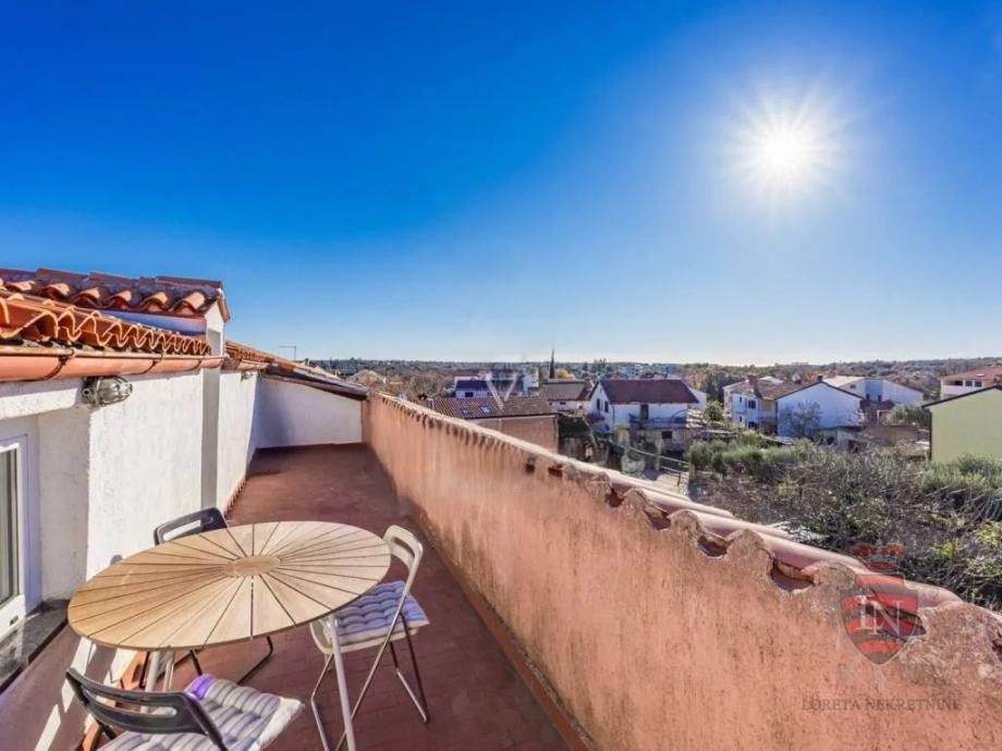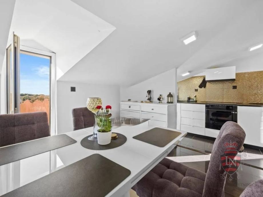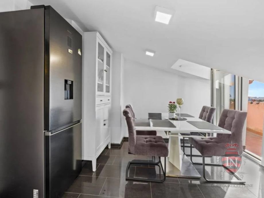 Samo 10 minuta vožnje od povijesne jezgre Rovinja, ovaj potpuno renovirani stan nudi izvrsnu priliku na atraktivnoj lokaciji. Smješten na posljednjem katu zgrade sa šest stambenih jedinica, stan ima ukupnu površinu od 93 m², uključujući terasu od 14,5 m² i privatni vrt od 57 m². Stan obuhvaća modernu kuhinju s blagovaonicom, hodnik, kupaonicu, dvije spavaće sobe i ured, koji je prvotno bio treća spavaća soba. Također ima spremište koje se može pretvoriti u dodatnu sobu.
