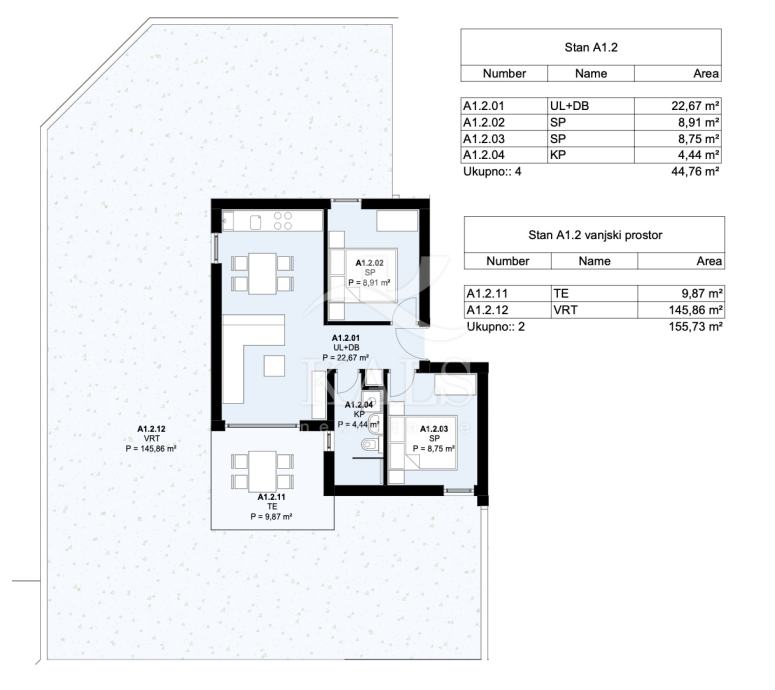 Površina stambenog prostora iznosi 44,76, terase 9,87 m2 i vrta 145,86 m2.