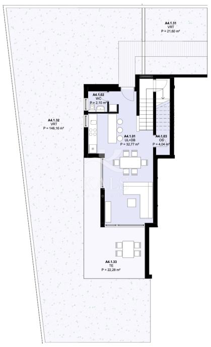 -PRIZEMLJE: dnevni boravak s blagovaonicom i kuhinjom, wc