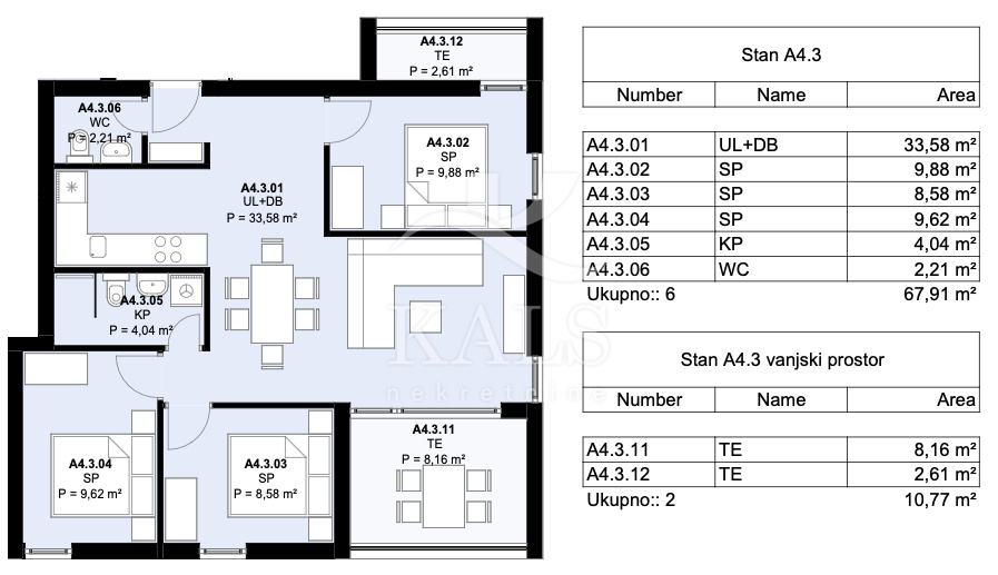 Površina stambenog prostora iznosi 67,91, terase 8,16 m2 i 2,61 m2.