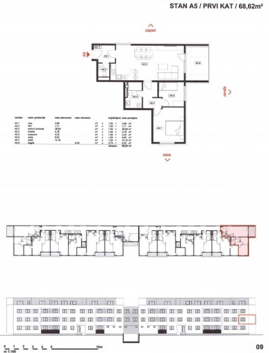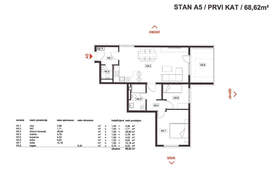 Stan A5: 3-sobni, 1. kat, neto korisne površine 68,62 m2, sastoji se od ulaznog prostora, dnevnog boravka s kuhinjom i blagovaonicom, dvije spavaće sobe, kupaonice, WC-a i loggie.
