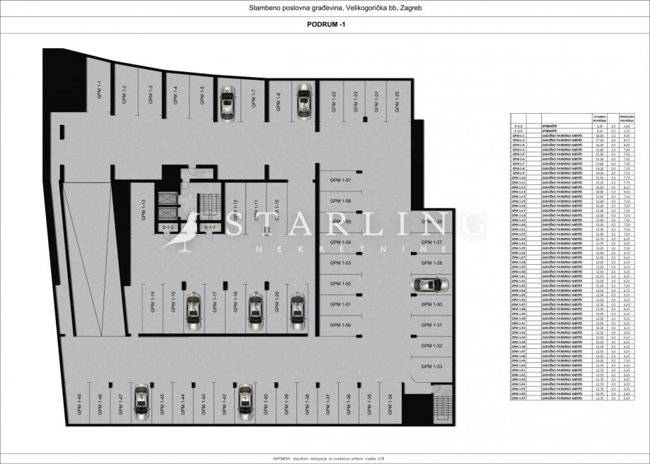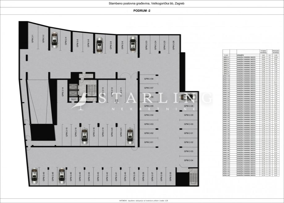Uz svaki stan je obvezna kupnja jednog garažnog parkirnog mjesta i spremišta. Garažna parkirna mjesta se nalaze na -2 etaži dok se spremišta nalaze od 1. do 5. kata.