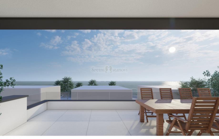 Ovaj stan se nalazi na 2. (zadnjem) katu te ima 77,07 m2 unutarnje površine i prostranu, djelomično natkrivenu terasu s pogledom na more od 41,36 m2. Stan se sastoji od ulaznog hodnika, dnevnog boravka s kuhinjom i blagovaonom, 3 spavaće sobe i 2 kupaone. Iz dnevnog boravka i spavaće sobe se izlazi na veliki balkon.