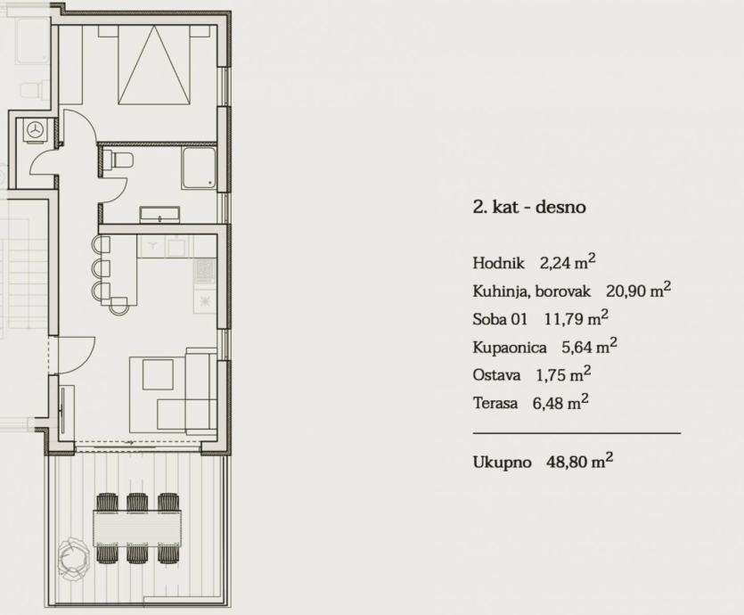 This penthouse apartment consists of an entrance hall, a bedroom, a bathroom, a laundry room, a living room with kitchen and dining room and a terrace. 1 outdoor parking space belongs to the apartment. It is possible to buy additional outdoor parking space. The apartments are equipped with air conditioners in all rooms and the living room, and an electric radiator is installed in the bathrooms. Depending on the customer's wishes, the installation of underfloor heating can be arranged in the phase of low roh bau.