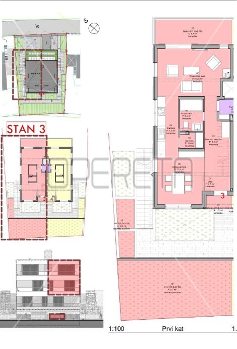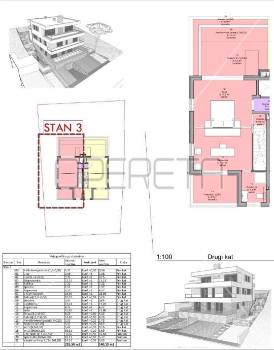 U zgradi se nalazi dvoetažni stan na katu od 140,10 m2. Prva etaža sastoji se velike dnevne sobe s blagovaonicom koja ima izlaz na balkon, kuhinje smještene uz dnevnu sobu, kupaonice i spreme. Na drugoj etaži nalazi se spavaća soba, dodatna soba koja se može koristiti po potrebi, kupaonica, prostrana terasa te dodatni balkon.