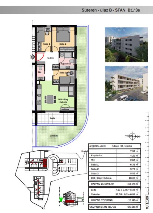 Stan B1/3S je trosoban stan, lociran u suterenu zgrade. Orijentiran je prema zapadu i jugu. Sastoji se od kuhinje i blagovaonice s dnevnim boravkom, hodnika, kupaonice,wc-om i tri sobe.Sa zapadne strane ima lođu i zelenu površinu.