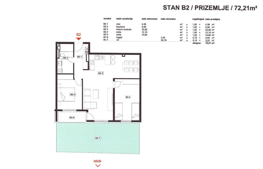 Stan B2: 3-sobni, prizemlje, neto korisne površine 72,21 m2, sastoji se od ulaznog prostora, dnevnog boravka, kuhinje i blagovaonice, dvije spavaće sobe, kupaonice, loggie i vrta.