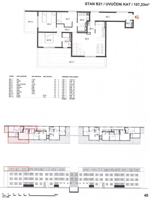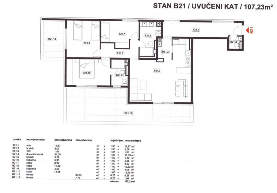 Stan B21: 4-sobni, 3. kat (penthouse), neto korisne površine 107,23 m2, sastoji se od ulaznog prostora, dnevnog boravka s kuhinjom i blagovaonicom, tri spavaće sobe, dvije kupaonice, WC-a i dvije nenatkrivene terase.