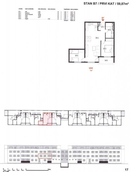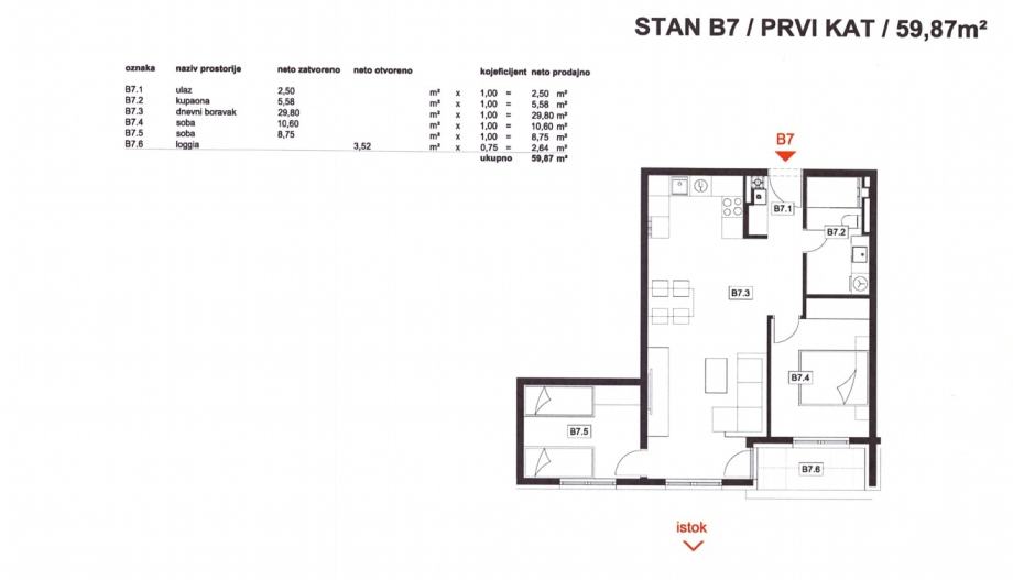 Stan B7: 3-sobni, 1. kat, neto korisne površine 59,87 m2, sastoji se od ulaznog prostora, dnevnog boravka s kuhinjom i blagovaonicom, dvije spavaće sobe, kupaonice i loggie.