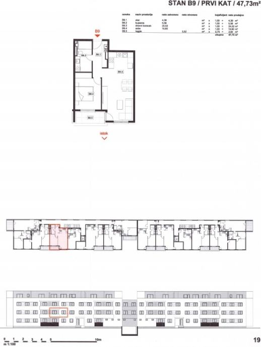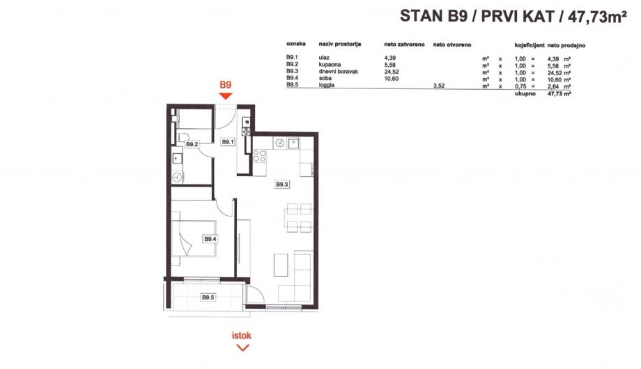 Stan B9: 2-sobni, 1. kat, neto korisne površine 47,73 m2, sastoji se od ulaznog prostora, dnevnog boravka s kuhinjom i blagovaonicom, jedne spavaće sobe, kupaonice i loggie.