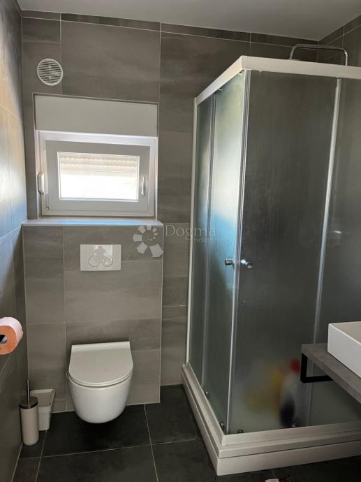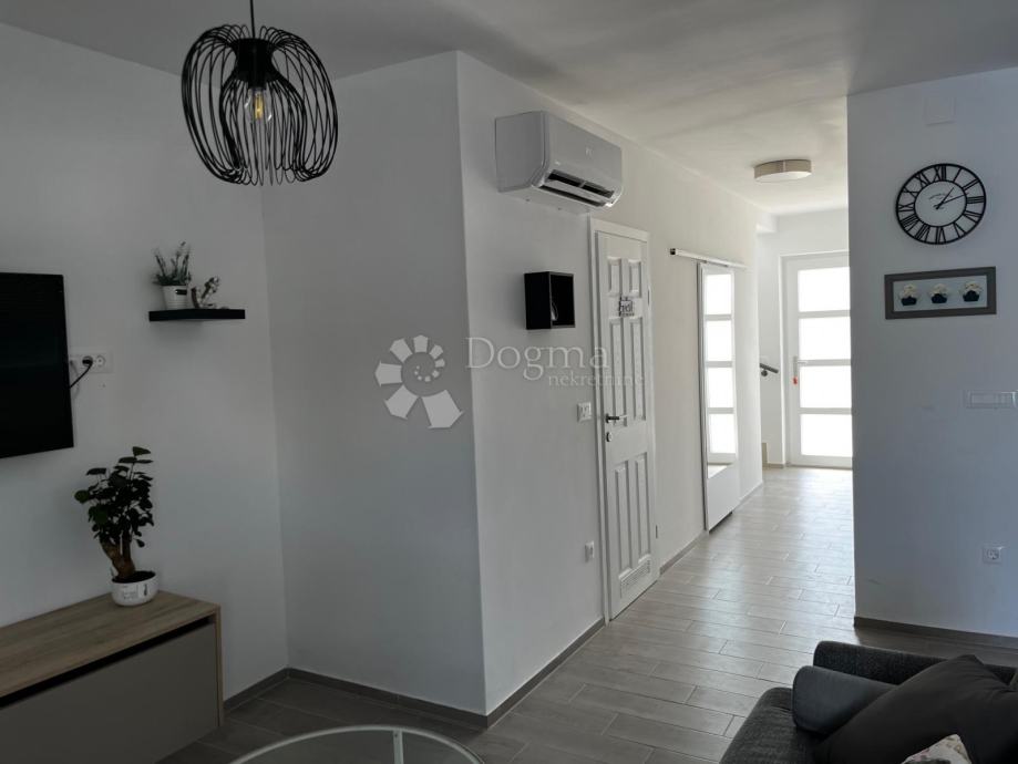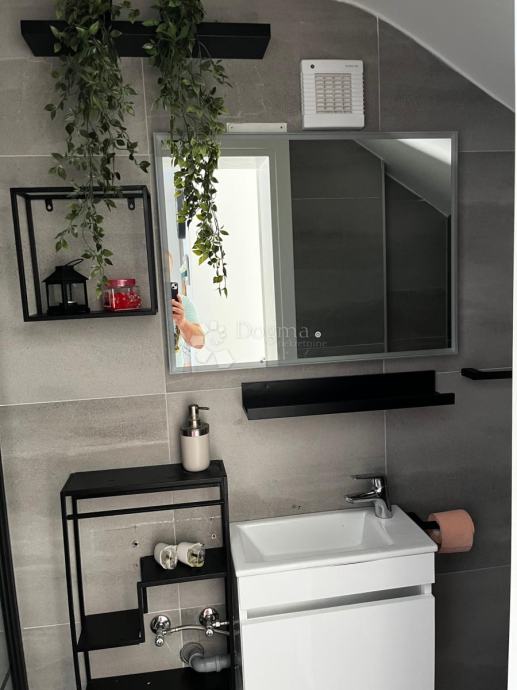 Stan je koncipiran u dvije etaže - u prizemlju je kuhinja sa blagovaonom i dnevnim boravkom i kupaonom te jednom spavaćom sobom. Na katu su još tri spavaće sobe i kupaona te loggia. Stanu pripada okućnica sa vlastitim bazenom i tri parkirna mjesta. Izvrsna mirna lokacija, a plaža i centar su svega nekoliko minuta hoda udalje