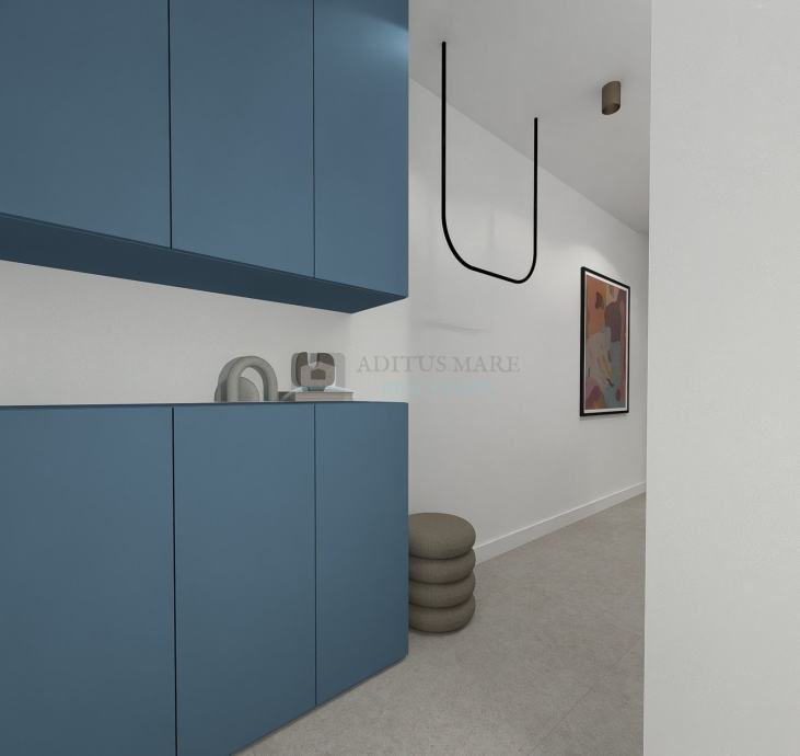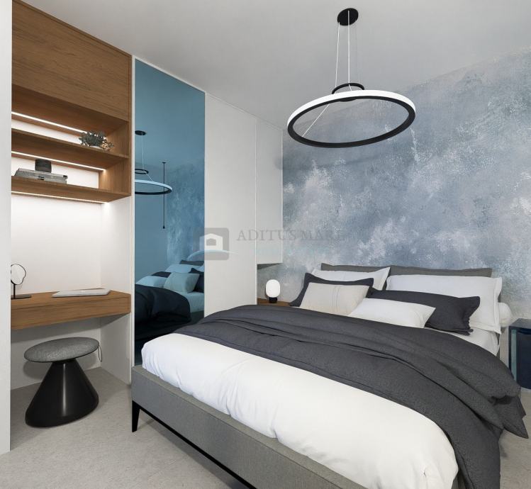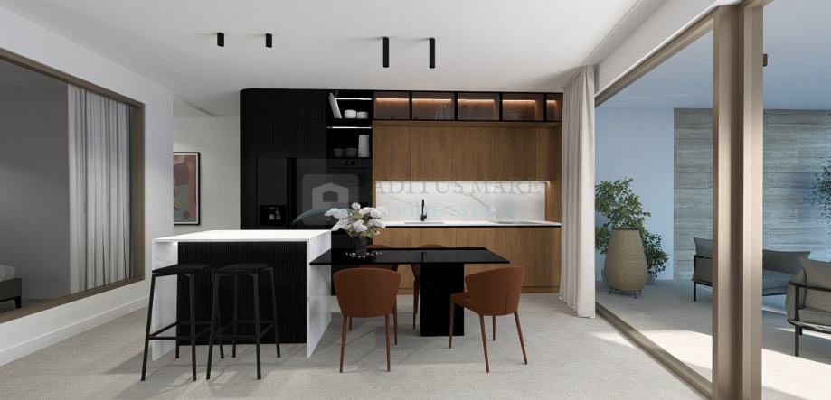 Ono što ovaj stan čini posebitim je otvoreni prostor kuhinje i dnevnog boravka koji vodi na terasu s bazenom i pogledom na more te na balkon. Stan sadrži tri spavaće sobe te dva kupatila. U ovoj fazi gradnje potencijalnim kupcima je omogućeno sudjelovanje u uređenju interijera prema vlastitim željama.