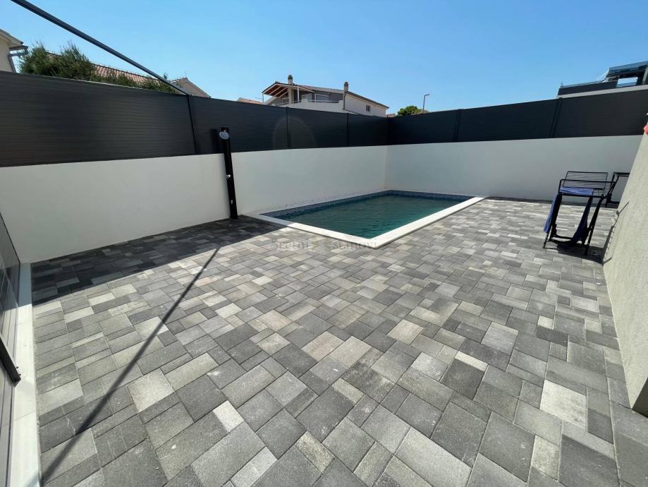 Prvi stan se sastoji od dnevnog boravka s kuhinjom i blagovaonom, 2 spavaće sobe, kupaone i terase. Na terasi se nalazi ostakljena konoba s kamin roštiljem, ljetnom kuhinjom i WC-om, a na nenatkrivenom dijelu terase nalazi se lijepi grijani bazen, što sve zajedno tvori prekrasan društveni prostor. Ukupna korisna (obračunata) površina stana s terasom je 62,65 m2.