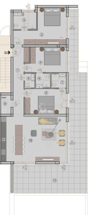 Stambena površina 156 m2, od čega je zatvorenog prostora 103 m2, a natkrivena terasa 53 m2, odlično je raspoređena na način da je prvi dio stana namijenjen spavaćim sobama s pripadajućim kupaonicama, te nas hodnik vodi, uz dodatni toalet i spremište, prema dnevnom boravku s kuhinjom i blagovaonom otvorenog koncepta.