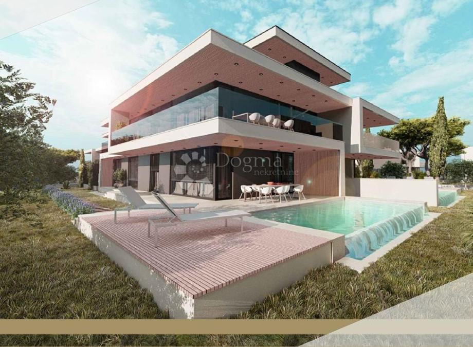 Na lijepoj lokaciji s odličnom povezanosti, tek 1500 metara blizine nekoliko lijepih plaža nalazi se impresivna manja stambena građevina, katnica sa 4 prostrana stana, od kojih 2 u prizemlju imaju svoje bazene i vrtove, dok 2 na katu imaju i krovne terase.