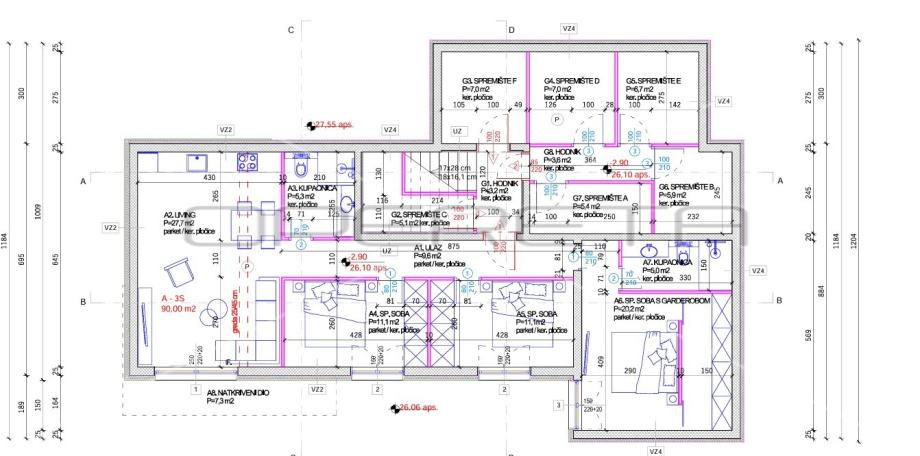 Podovi: Hrastov troslojni parket u dnevnim boravcima i sobama, keramičke porculanske pločice u ulaznim prostorima i kuhinjama.