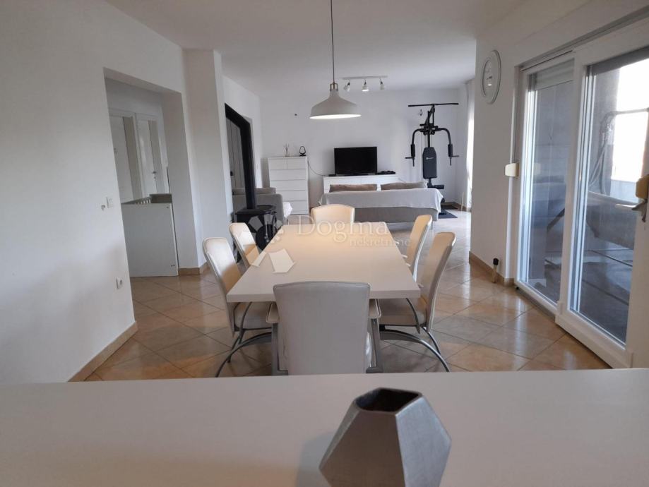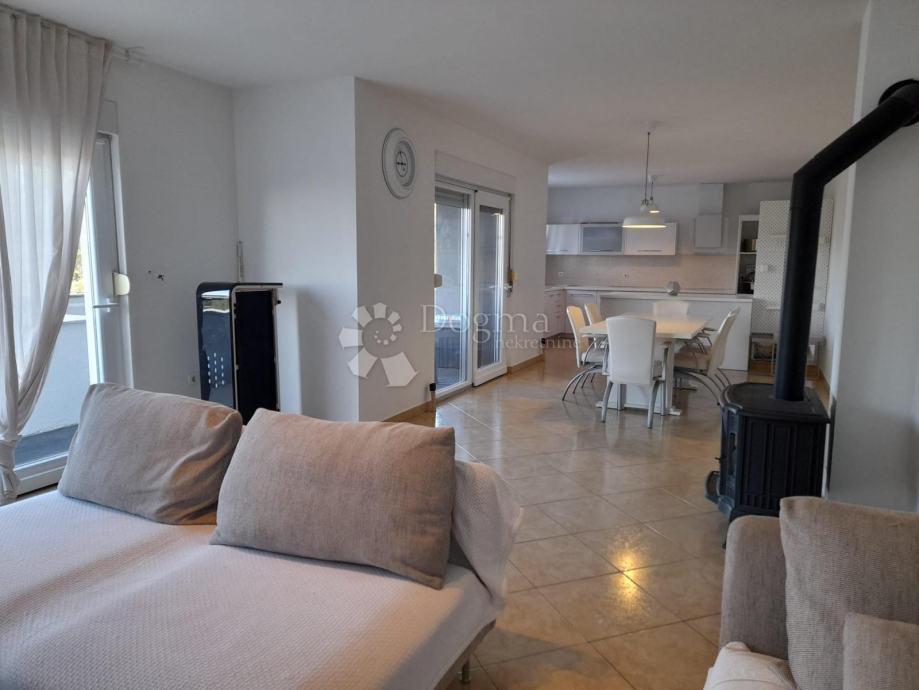 Dnevni boravak otvorenog koncepta koji se savršeno povezuje s modernom kuhinjom i blagovaonicom, čineći ovaj prostor središtem doma za obiteljska okupljanja ili društvena događanja.
