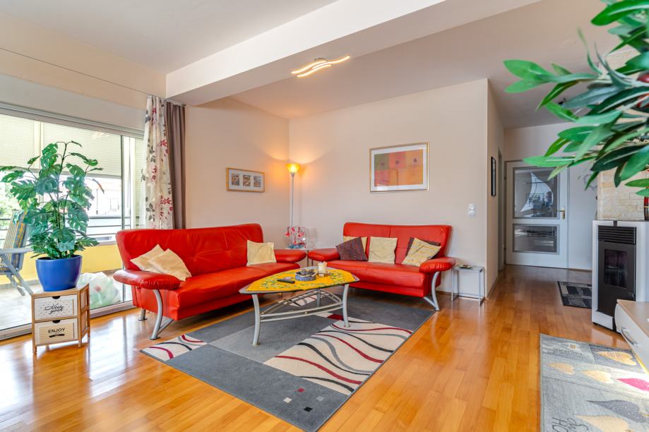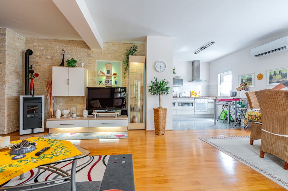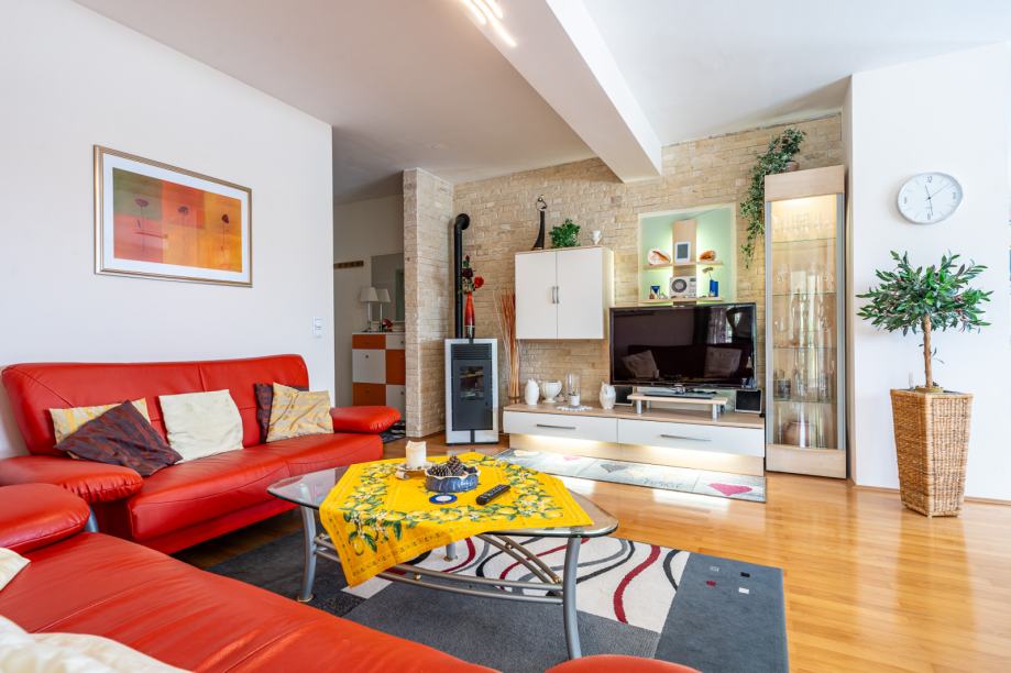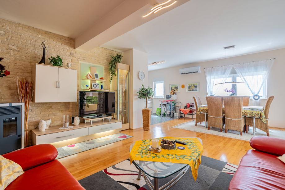 Stan je u potpunosti opremljen svime što možete zamisliiti i zatrebati, uz mnogobrojne korisne dodatke. Kompletan namještaj je visoke kvalitete uvezen iz Njemačke, te jako malo korišten i kao nov (kožne sjedeće garniture, smart Samsung TV 50'', stereo, nova pečnica i ploča za kuhanje, perilica suđa, perilica rublja, kompletno posuđe i pribor za kuhanje, mikrovalna, aparat za kavu, nova LED rasvjeta...). Podovi su obloženi parketom i pločicama 1. klase, dok je na zidu dnevnog boravka postavljen ručno klesani brački kamen.