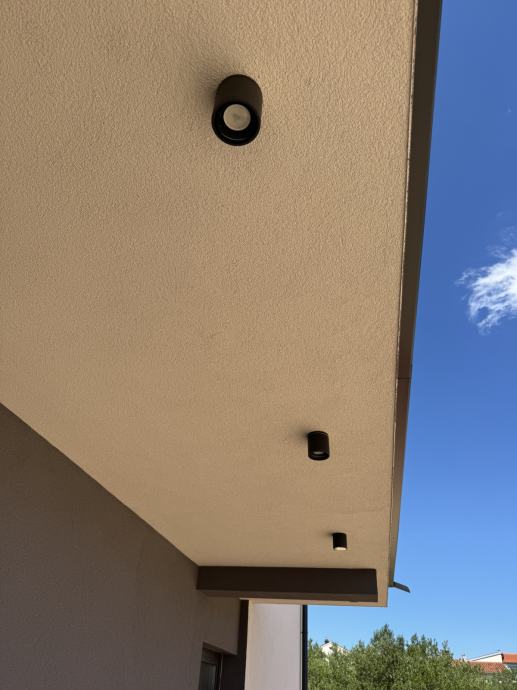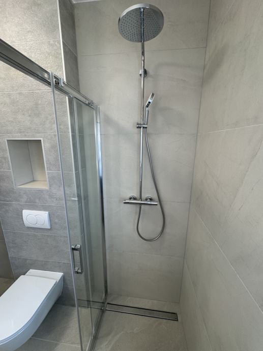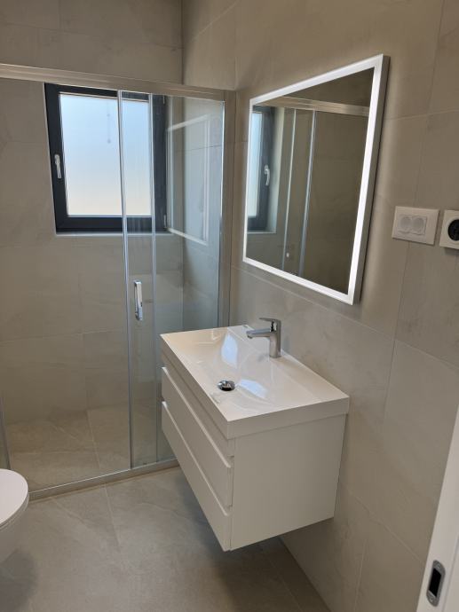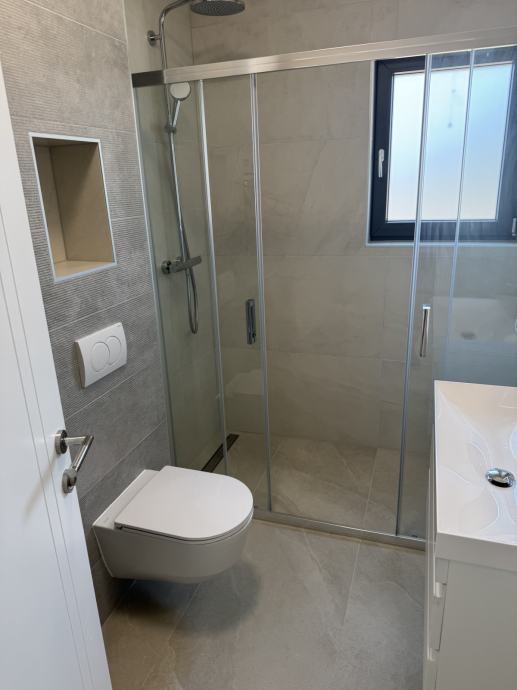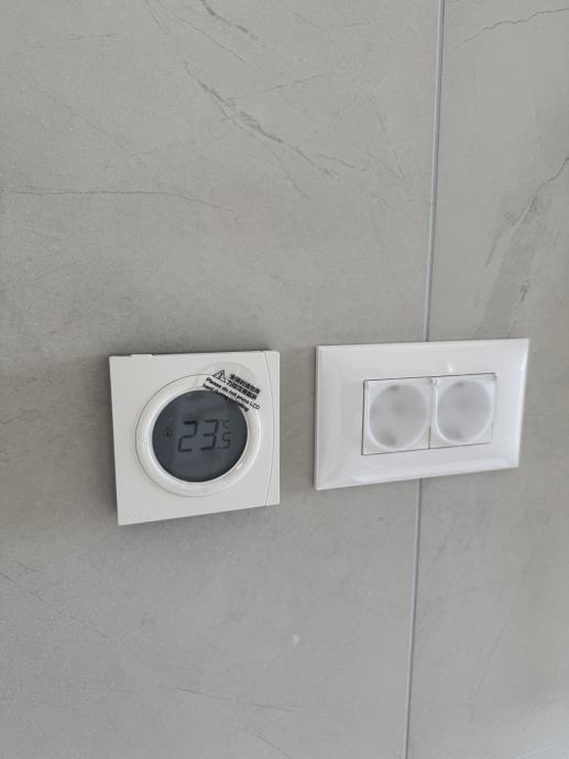 Podno grijanje u dnevnom boravku, kuhinji, hodniku, kupaonici i WC-u tj svugdje osim spavaćih soba, vanjska priprema za punjače auta na struju, osvjetljen parking, zid i ograda oko cijelog objekta, uz dodatni zid i ogradu za prizemlje. Na ovo ide i apsolutno kompletna oprema kupaonice po najvišim standardima: Hansgrohe tuš prve kategorije i česma za lavabo, vrata tuša, Laufen školjka, ogledalo i ormarić.