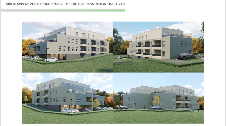 NOVOGRADNJA - BJELOVAR, Centar - Trg Stjepana Radića 3. Trosoban stan veličine 96,35 m2 na prvom katu.