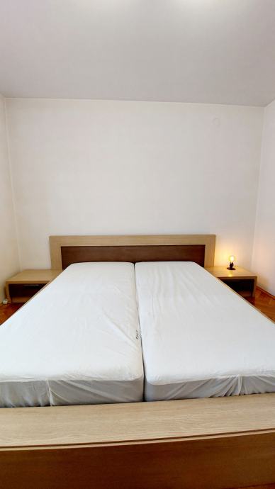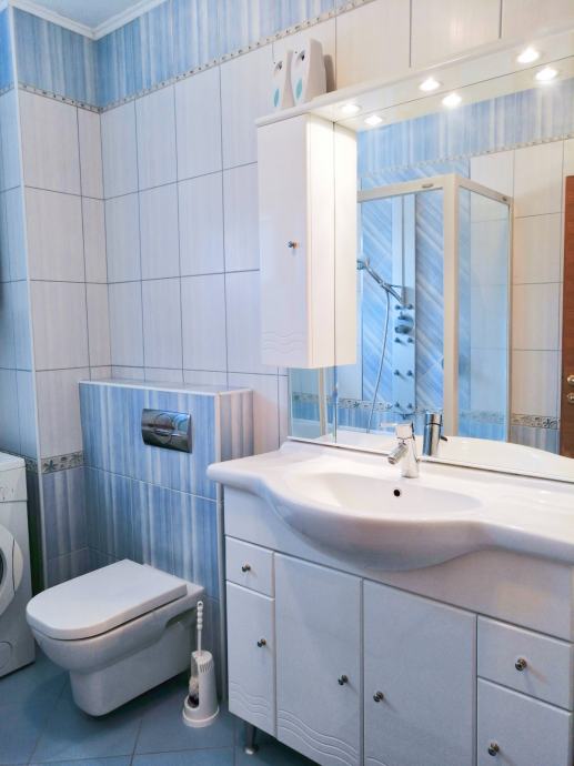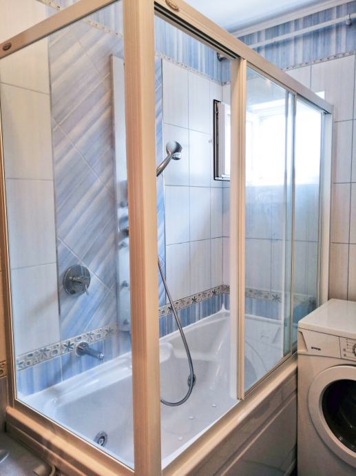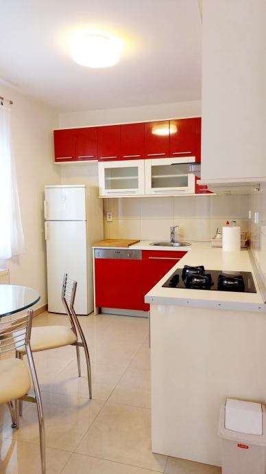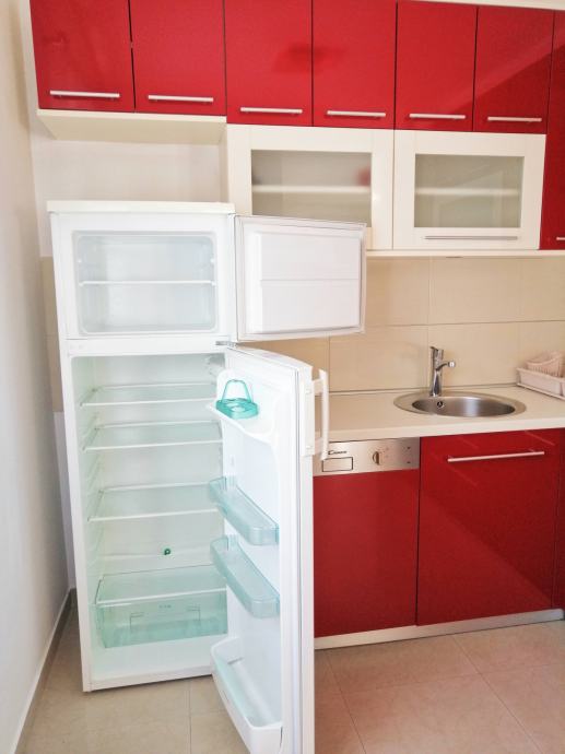 Kuhinja je praktična i potpuno opremljena, a u stanu se nalaze hladnjak s ledenicom, električna pećnica, kombinirana elektro/plinska ploča za kuhanje, perilica posuđa, napa, perilica rublja, Vaillant plinski bojler za grijanje i toplu vodu te Panasonic klima uređaj. U dnevnoj sobi se nalaze regal i poličar, a u glavnoj spavaćoj sobi novi i nekorišteni madraci. U predsoblju su veliki cipelarnik, ogledalo i vješalica.